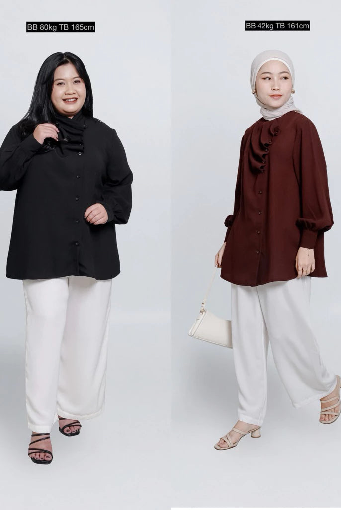 Material blouse juga menjadi perhatian besar. Bahan yang ringan, breathable, dan jatuh seperti katun premium, crepe, hingga rayon silk makin digemari karena memberikan kenyamanan maksimal tanpa mengorbankan estetika. Blouse-blouse ini sangat fleksibel—bisa dikenakan untuk ke kantor, hangout santai, hingga acara semi-formal hanya dengan sedikit styling tambahan seperti belt, statement bag, atau hijab bermotif.