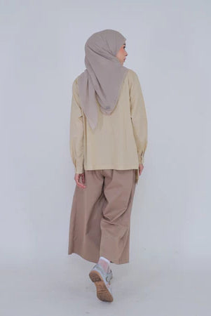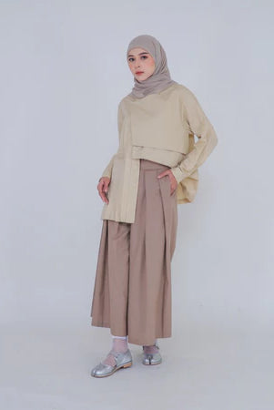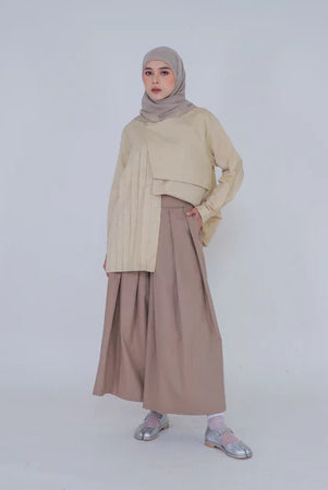 Dari sisi styling, celana kulot 2025 akan lebih sering dipadukan dengan atasan berpotongan boxy atau blouse berkerah minimalis, memberikan tampilan yang sleek dan profesional. Aksen layering dengan outerwear ringan seperti blazer atau vest juga akan menjadi kunci untuk menciptakan look yang modern namun tetap modest. Tak hanya untuk agenda formal, celana kulot juga hadir dalam versi yang lebih santai dengan sentuhan sporty—seperti detail drawstring atau bahan stretch—yang cocok untuk tampilan smart casual sehari-hari.