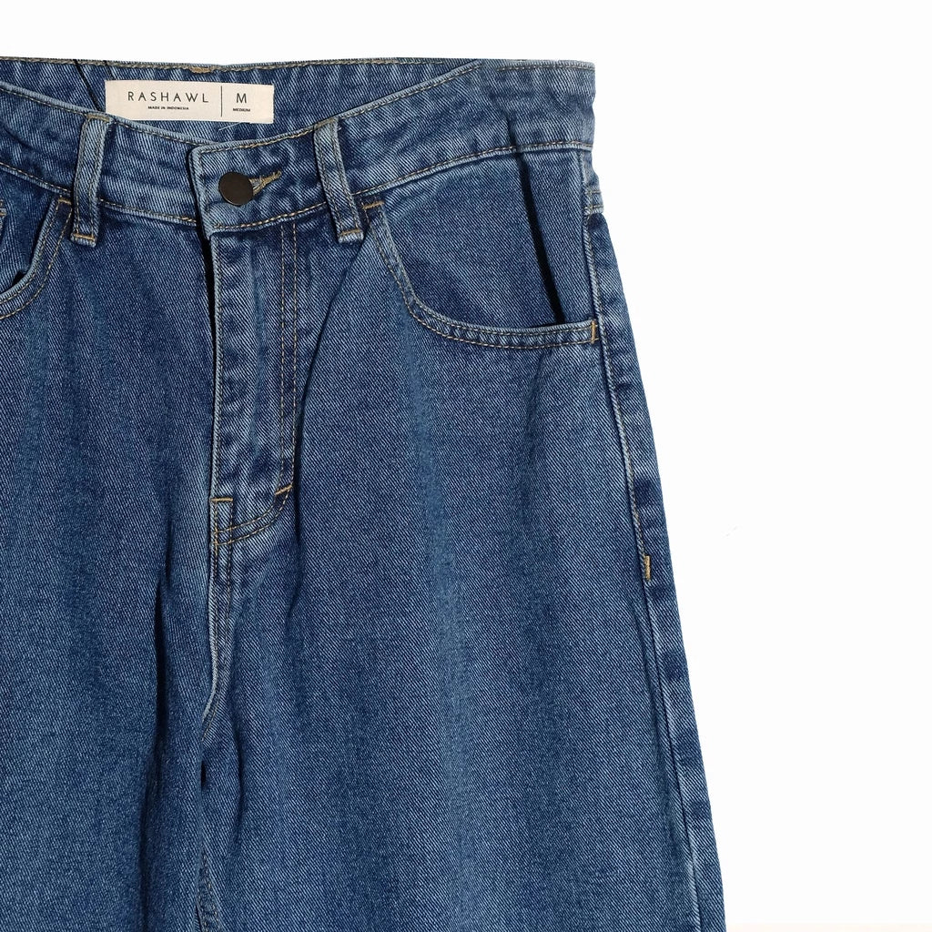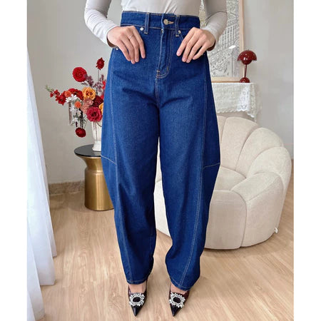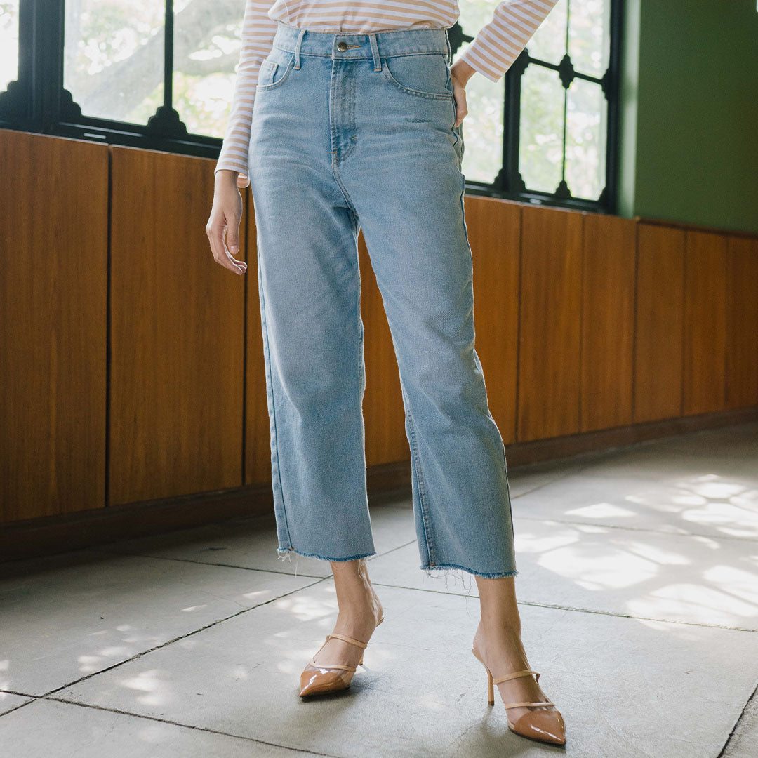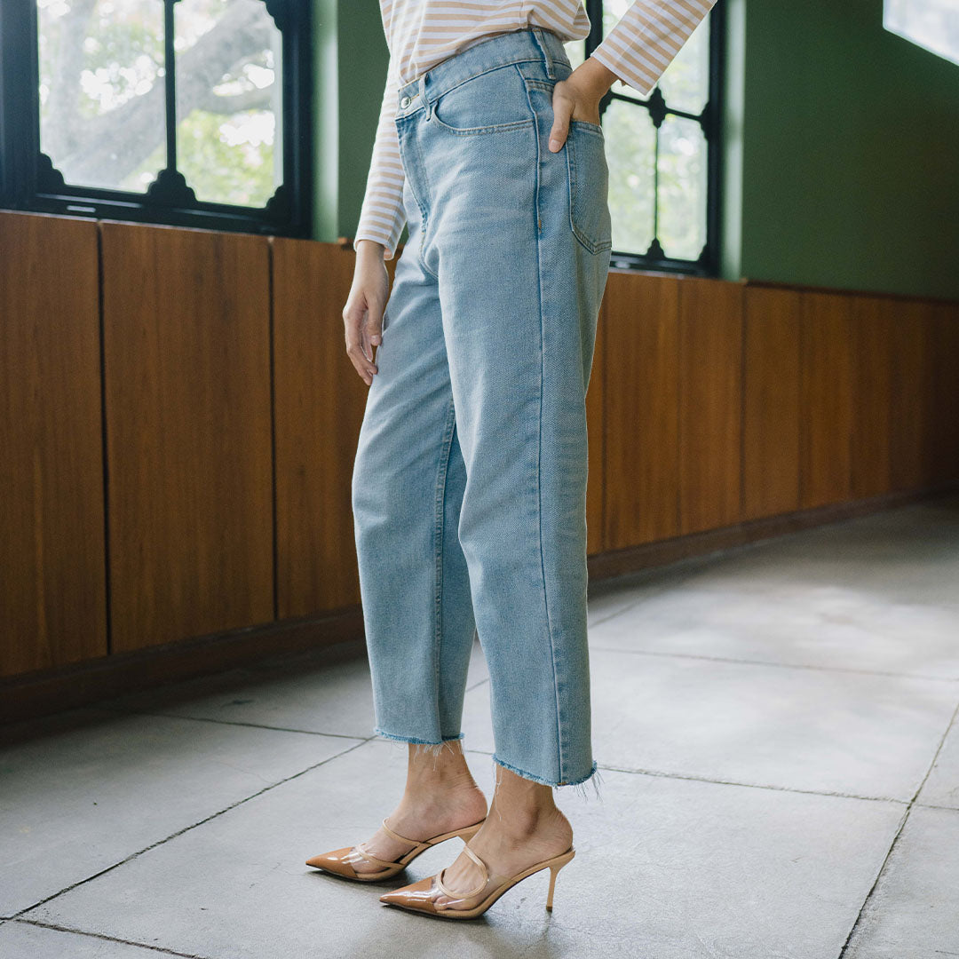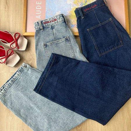 Model celana denim dengan potongan lebar tapi panjangnya hanya sampai betis atau sedikit di atas mata kaki. Cocok untuk tampilan santai tapi tetap rapi dan anggun.