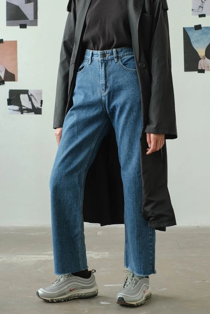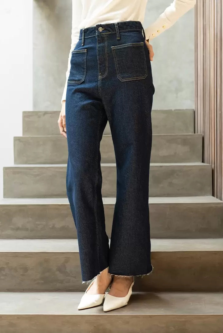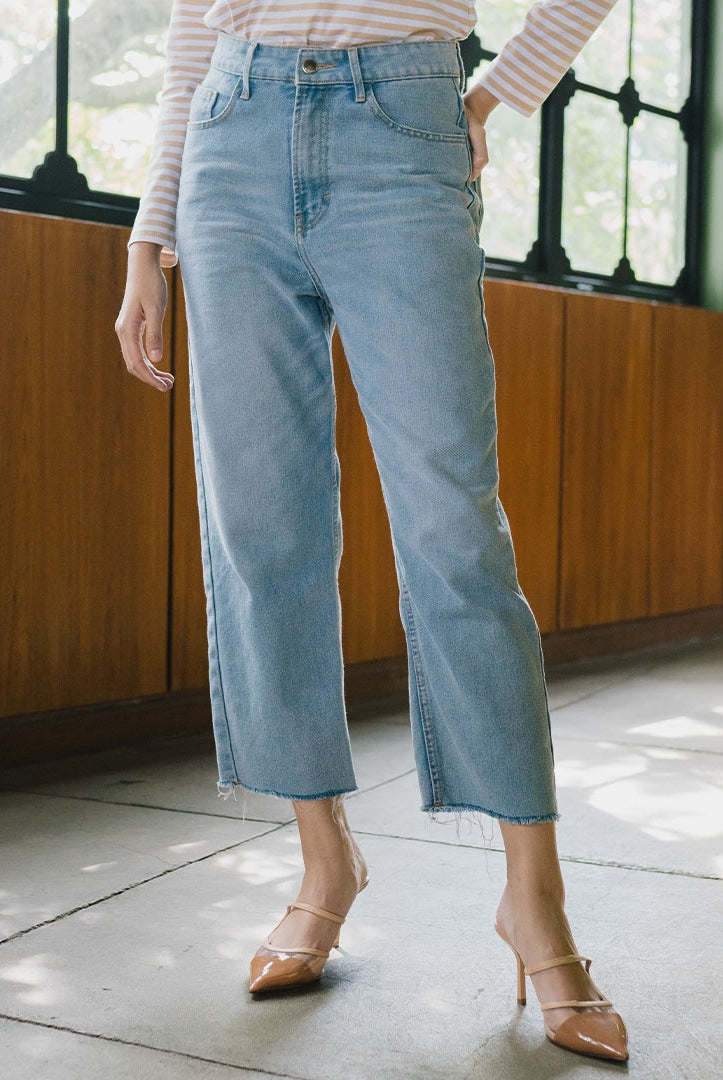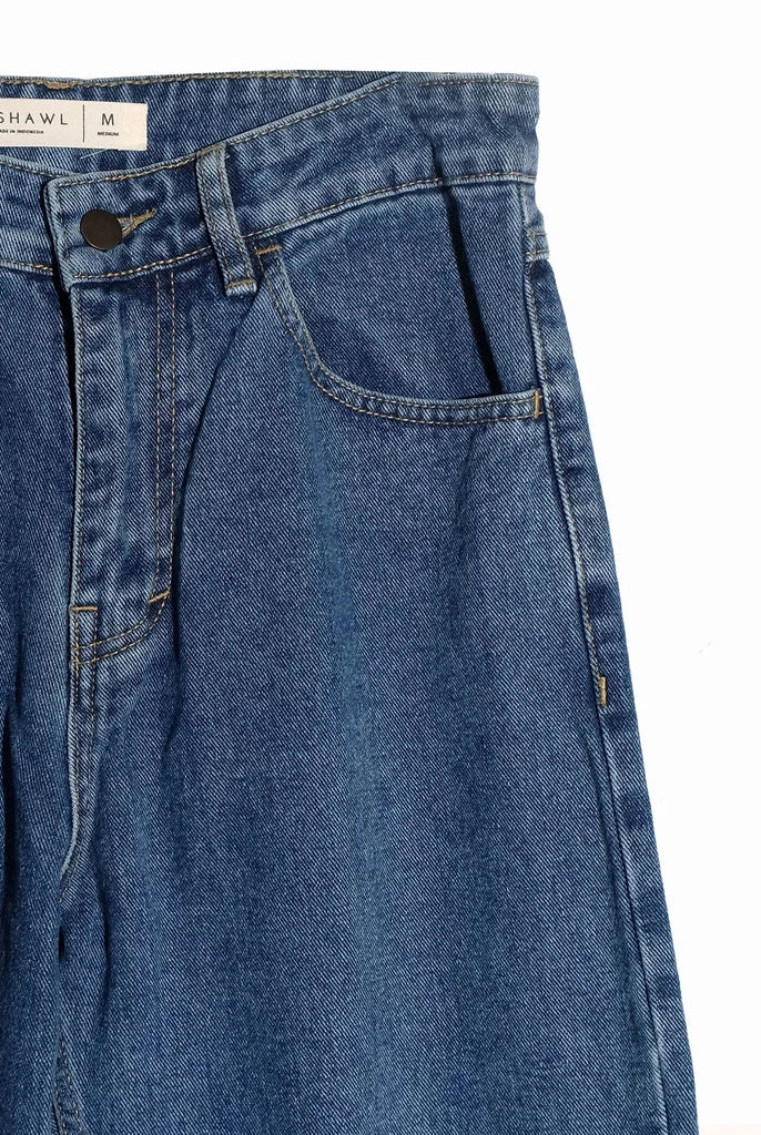 Model celana denim dengan potongan lebar tapi panjangnya hanya sampai betis atau sedikit di atas mata kaki. Cocok untuk tampilan santai tapi tetap rapi dan anggun.