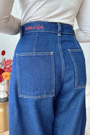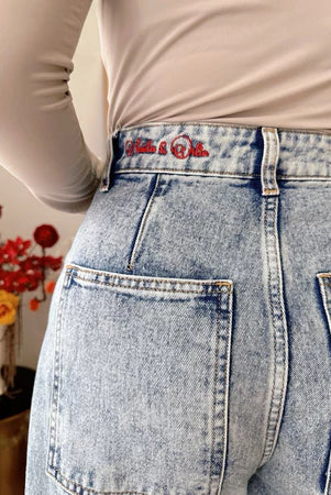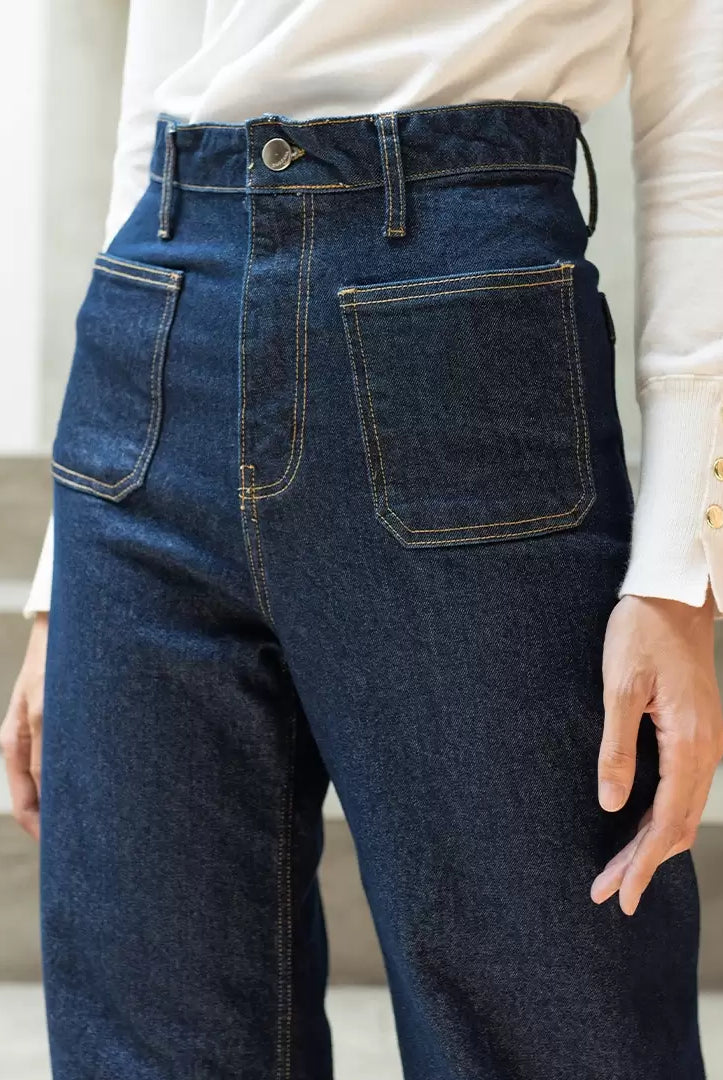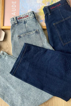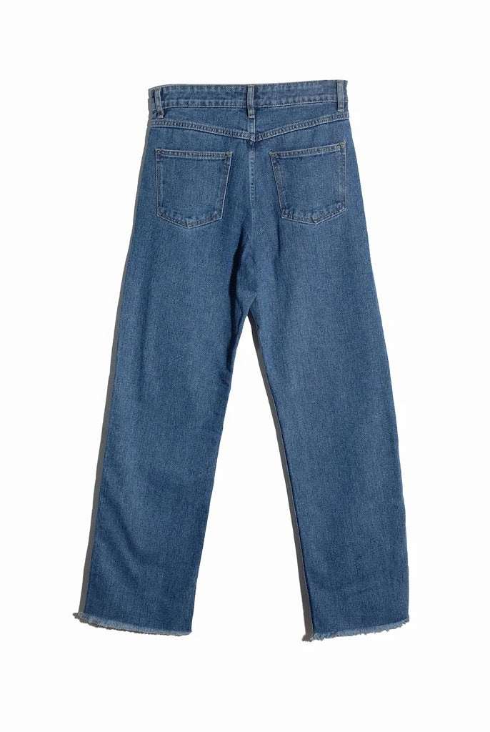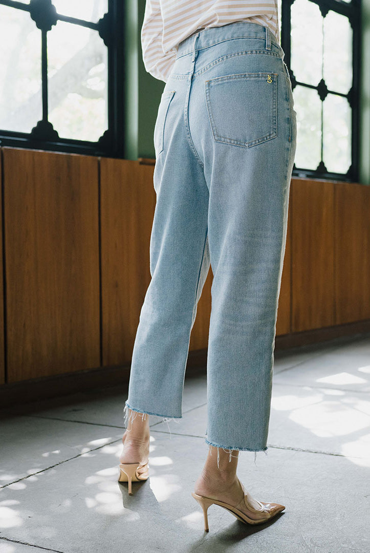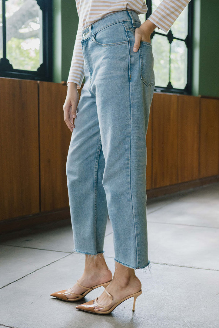 Model celana denim dengan potongan lebar tapi panjangnya hanya sampai betis atau sedikit di atas mata kaki. Cocok untuk tampilan santai tapi tetap rapi dan anggun.