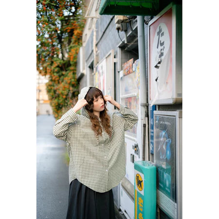 Oversized Hooded Shirt in Green Plaid - Yestoday
