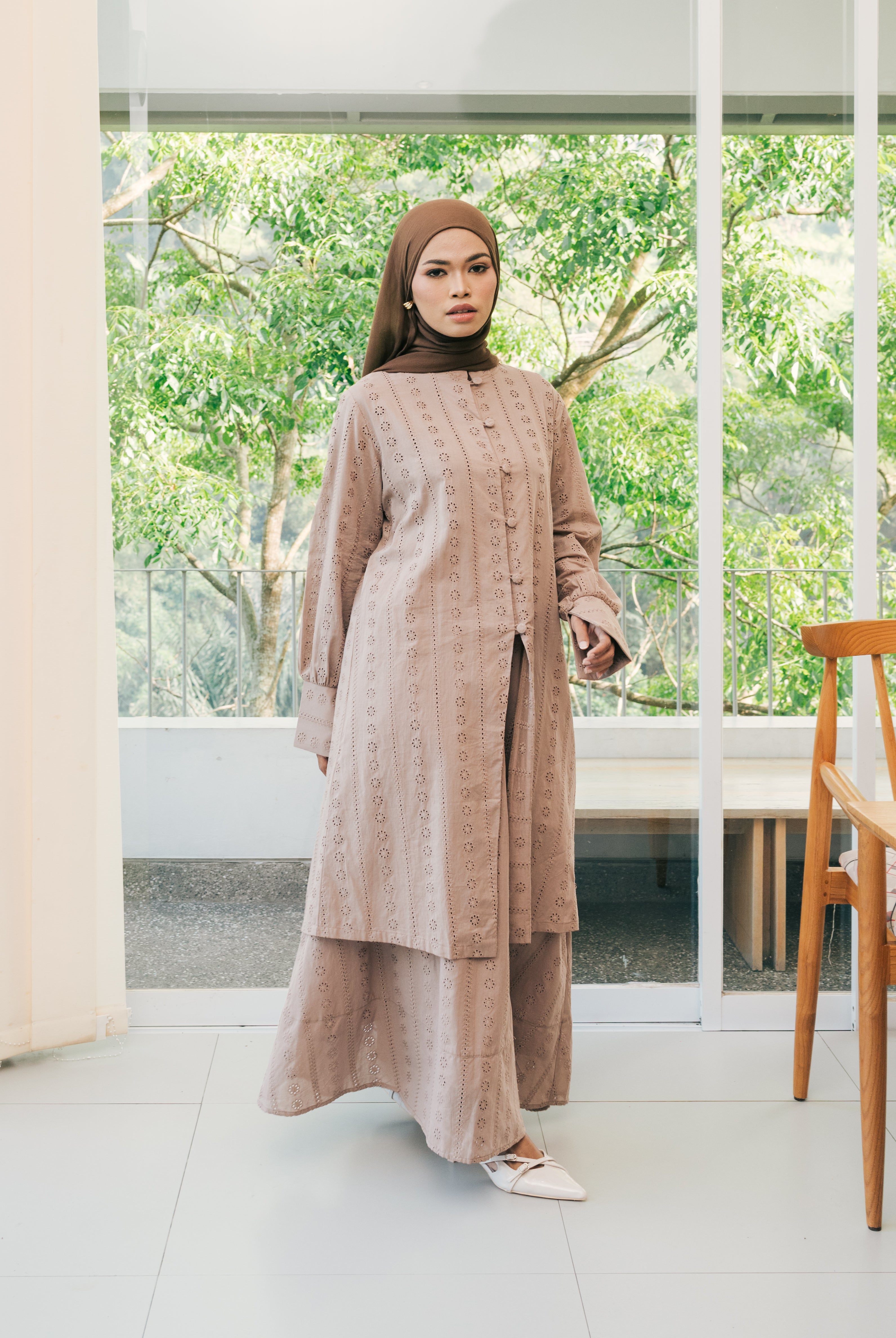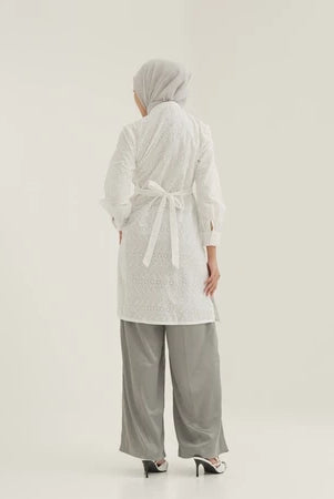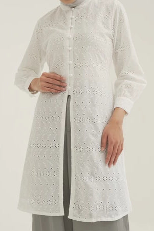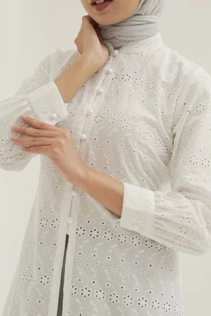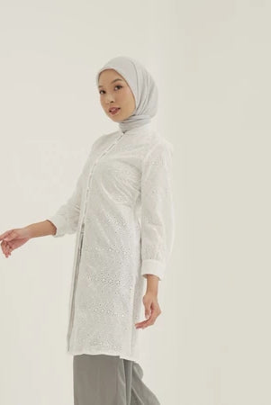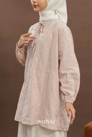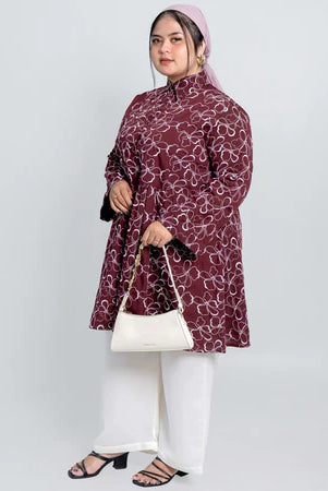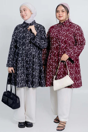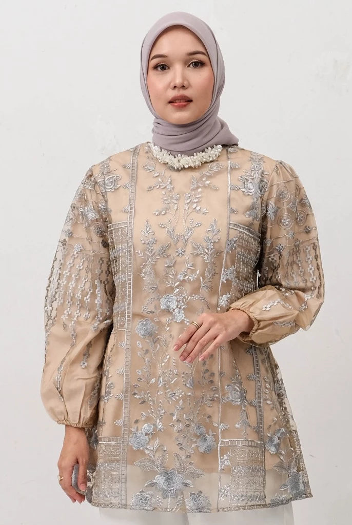 Penambahan detail brokat atau potongan peplum pada tunik memberikan kesan feminin dan elegan, cocok untuk acara formal maupun semi-formal.