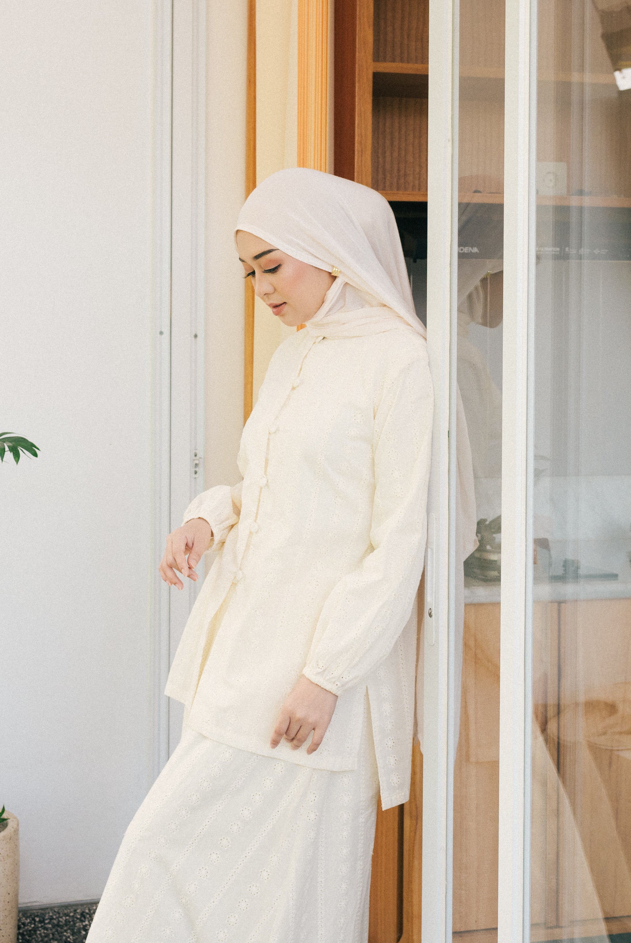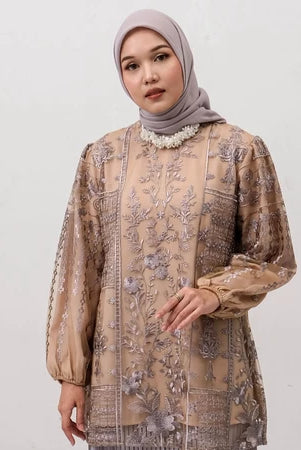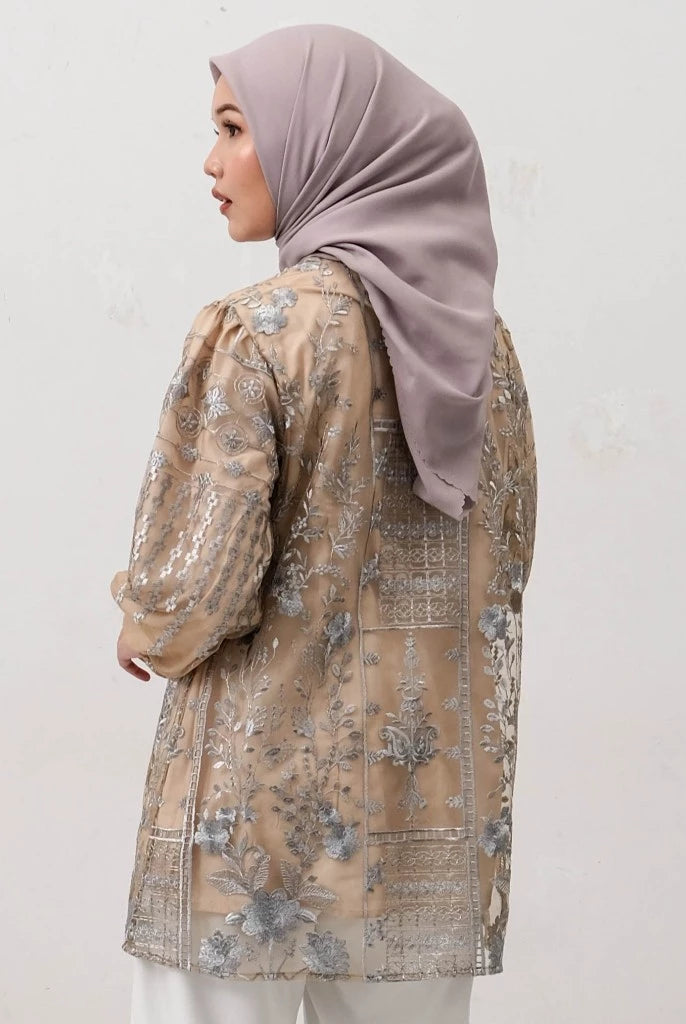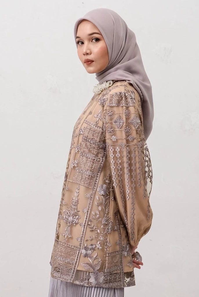 Menggabungkan tunik dengan elemen kain tradisional seperti batik atau songket memberikan sentuhan budaya yang kaya dan tampilan yang anggun. - Detail Brokat dan Peplum