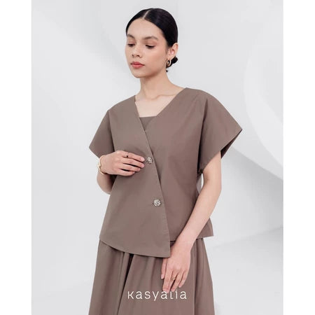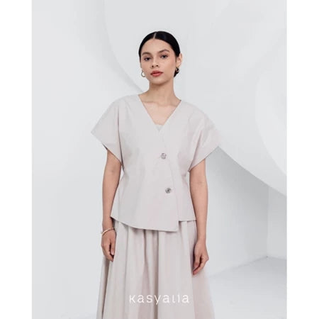 The Aeris Top is a modern, structured blouse featuring an asymmetrical button-down design for a unique, effortless look. With its relaxed silhouette and airy fabric, it blends sophistication and comfort, making it perfect for versatile styling.