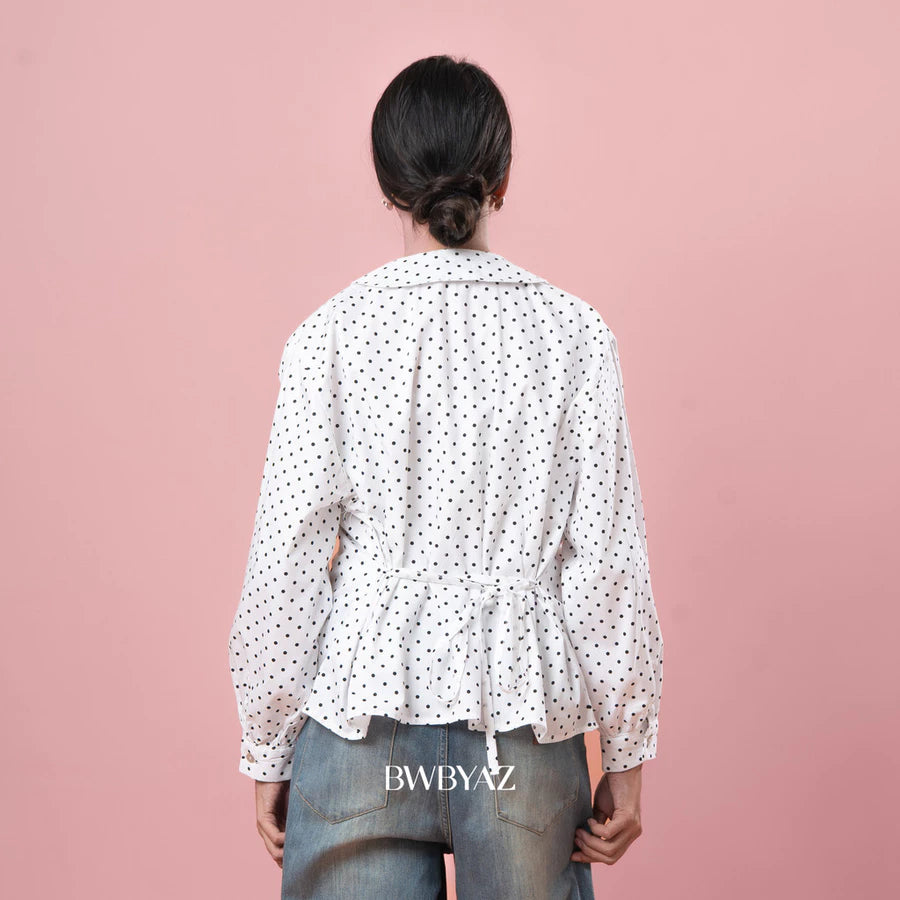 Althea Fitted Shirt. Fitted cut balanced with puff sleeves for volume. Small polka-dots add a playful yet neat visual texture.