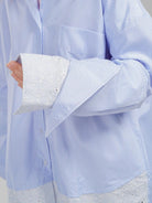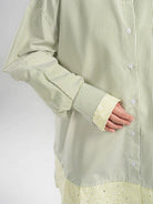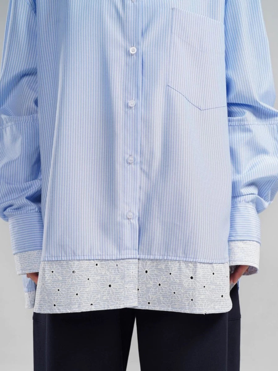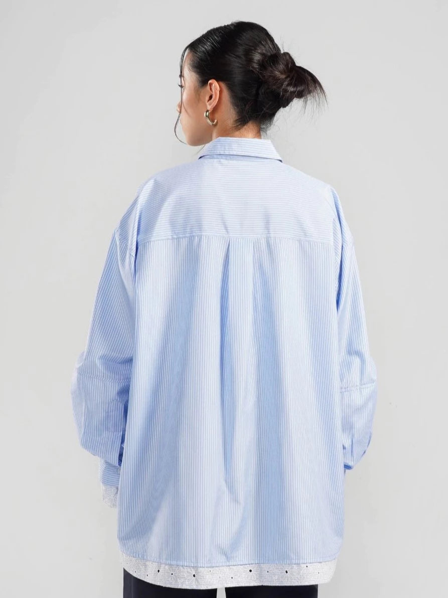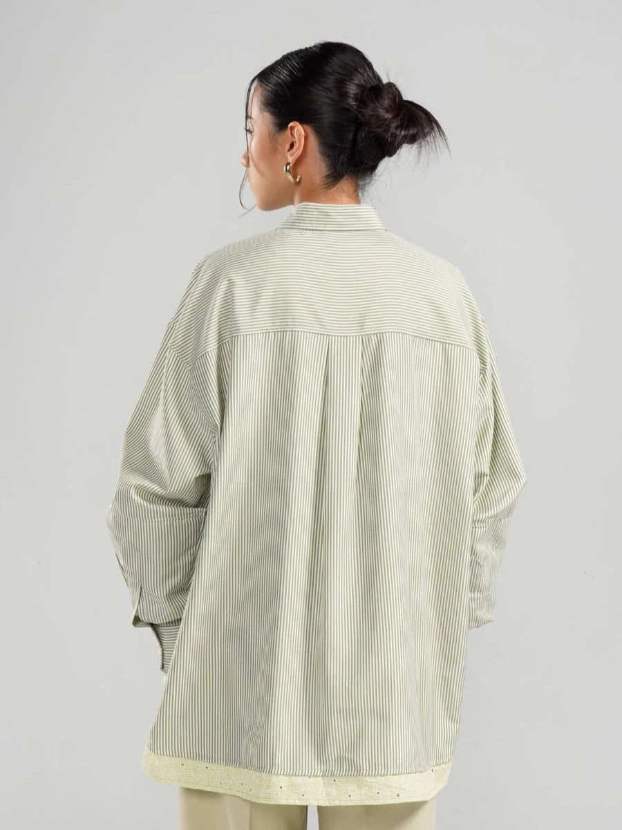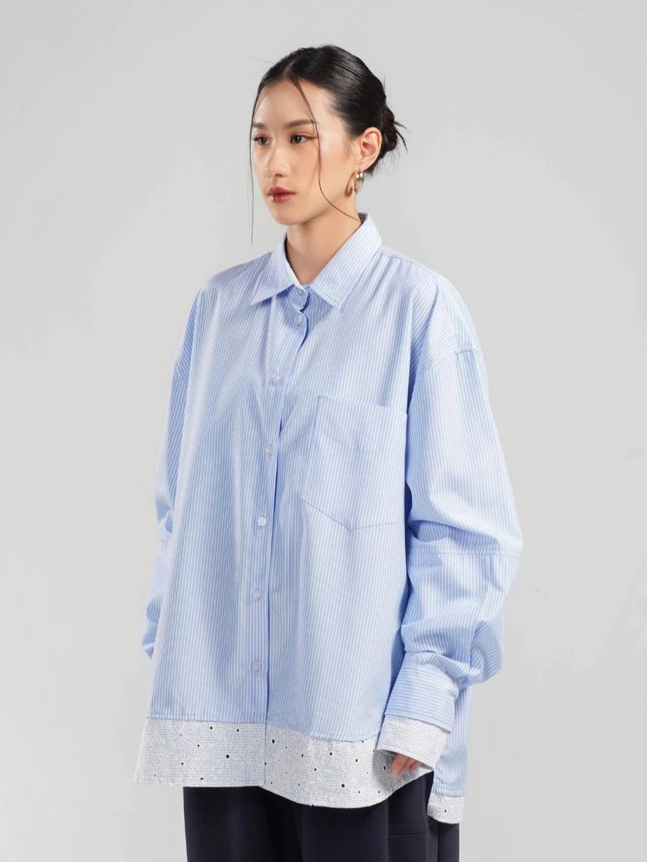 Kemeja lengan panjang bermotif garis dan outline bunga dengan nuansa yang lembut dan fresh. Bahannya ringan, nyaman, dan jatuh, cocok untuk aktivitas sehari-hari. Potongan oversize dengan detail pada bagian lengan tangan (cuff) yang bisa di styling sesuai gayamu.