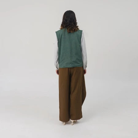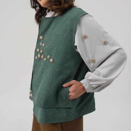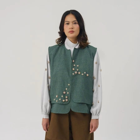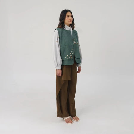 Bivara Vest is a simple vest crafted from comfortable materials, designed in a relaxed boxy fit. It features a unique front cut with layering details, hidden pockets on both sides, and our signature handmade beading accents for a polished finish. Ideal for layering and elevating an everyday outfit.