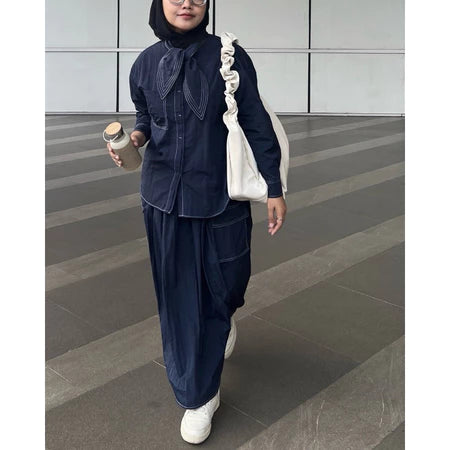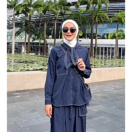 Setelan kemeja dan rok ini terbuat dari dusky crinkle parasut, bahan yang ringan dan tahan lama dengan tekstur berkerut alami yang memberikan kesan kasual namun tetap elegan. Crinkle parasut memiliki kemampuan tahan air, mudah menyerap keringat, dan tetap nyaman meskipun dikenakan dalam waktu lama.