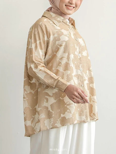 Material bahan yang digunakan Burn Out Flower yang halus dan ringan. Terdapat kancing di bagian depan dan di kedua pergelangan tangan kanan dan kiri, bagian pergelangan tangan sudah dilengkapi ban dan kerah sudah menggunakan model kerah daun. Tekstur kain memiliki pola semi-transparan dengan desain kontras antara bagian transparan dan juga motif flower yang menambah kesan feminim. Sudah dilengkapi dengan logo akrilik khas Mistyvori.