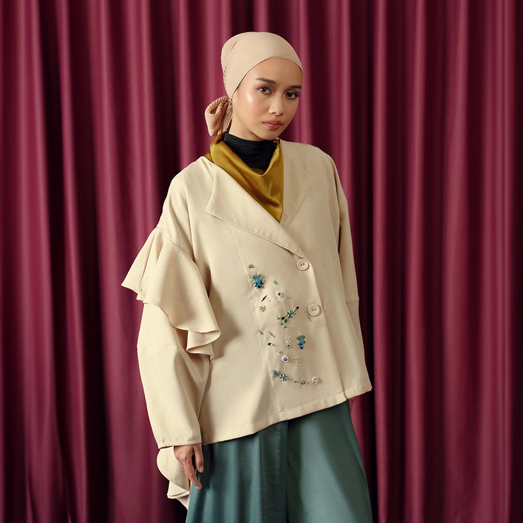 Danisha Outer, a versatile piece that effortlessly transitions from jacket to open-style top. Crafted from a fine, breathable fabric, this outer is comfortable for all seasons. Elevate your look with its delicate ruffles and embellishments. This timeless piece is perfect for adding a touch of chic to any outfit.