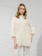 Blouse elegan dengen detail bordir bunga 3D yang sweet dan lembut berbahan soft crinkle with airy texture. Didesain dengan detail pleats pada kerah dan puffy sleeves yang memberi kesan elegan. Easily match with any bottoms.