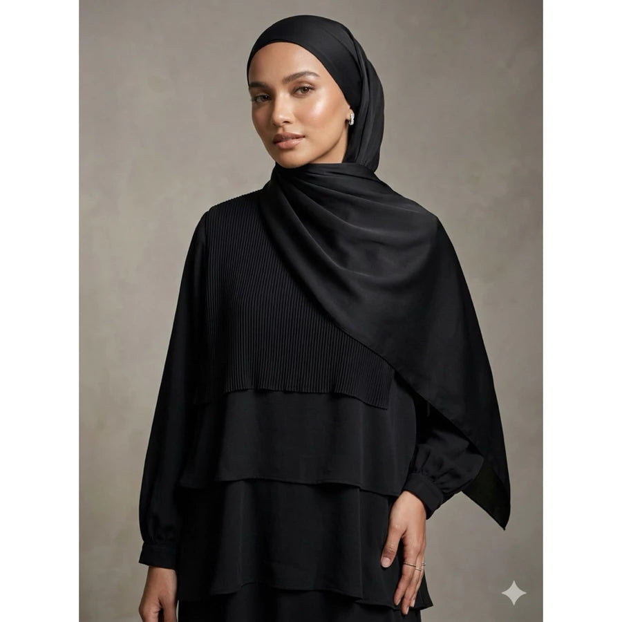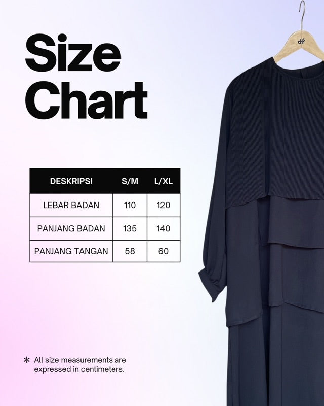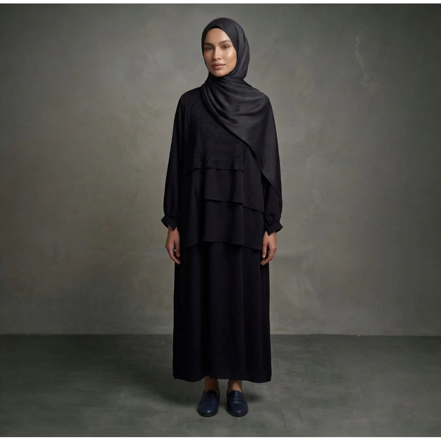 Derya Dress — dress panjang dengan siluet loose yang elegan. Didesain dengan layered pleats di bagian depan yang memberi dimensi cantik namun tetap simpel. Materialnya ringan dan jatuh, nyaman dipakai seharian, dengan potongan modest yang anggun dan effortless.