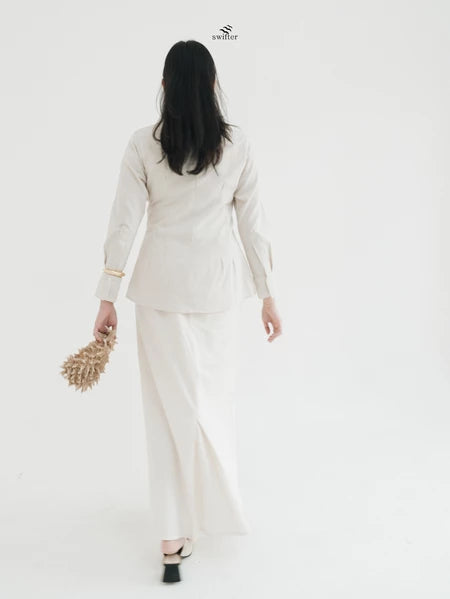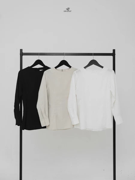 Blouse ini dilengkapi dengan resleting tersembunyi di bagian belakang untuk kesan yang mulus saat dikenakan, serta kancing kecil di pergelangan tangan sebagai sentuhan akhir yang sederhana tapi berkelas.