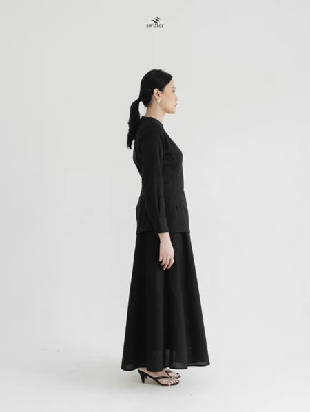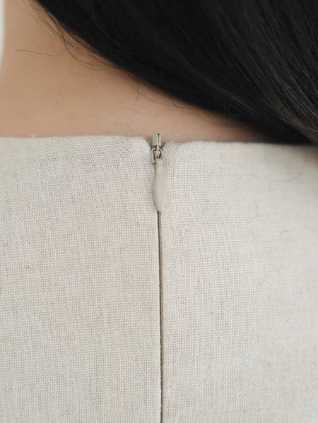 Thoughtful seam details at the upper and waistline accentuate the form gently, creating a clean and refined look. A discreet back zipper ensures a seamless fit, while buttoned cuffs at the wrists offer a tailored finish with quiet charm. Whether for everyday moments or intentional occasions, Elma stays grounded in simplicity and ease.