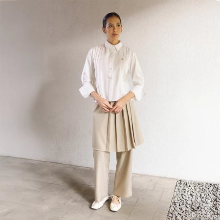 Felia Top is a perfect blend of contrasting and modern lines. This top is enhanced by symmetrical vertical line details, creating a sleek and elegant visual illusion. Suitable for those of you who like a minimalist look.