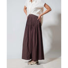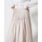 The design features a finely gathered waistline that transitions seamlessly into a full, architectural drape. With hidden side pockets and an elastic waistband— a balance between utility and modern femininity.