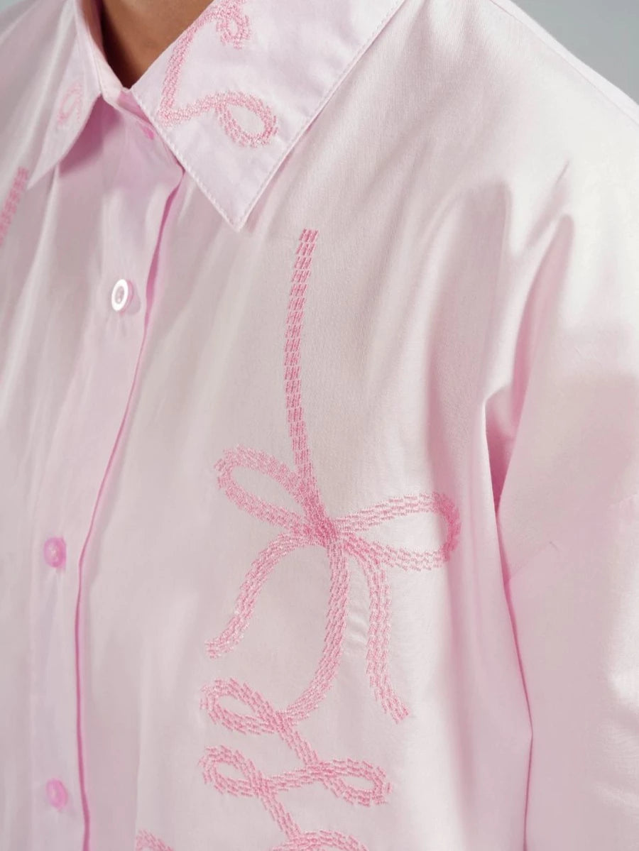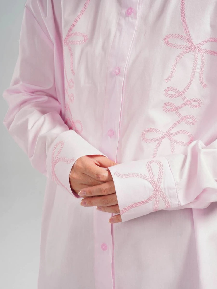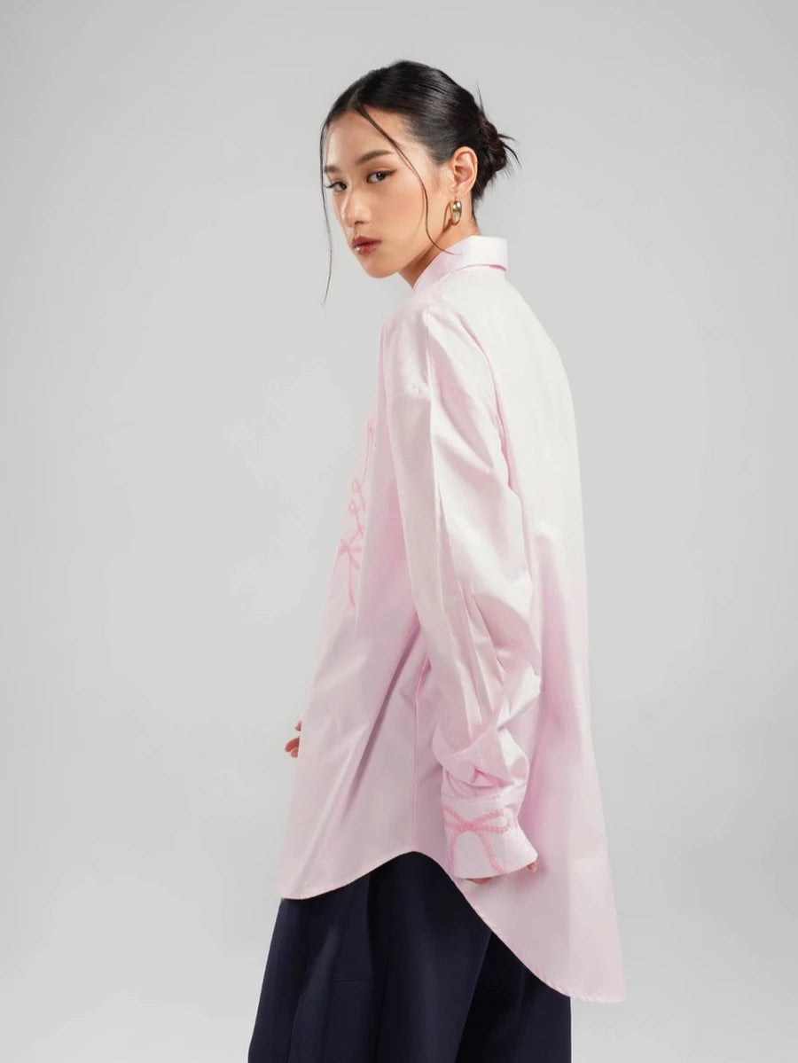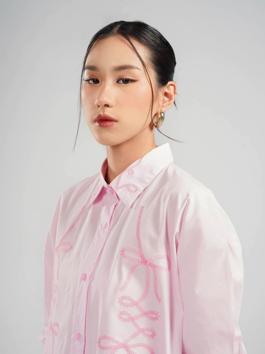 Detail bordir berbentuk pita ditempatkan secara asimetris pada bagian depan dan manset lengan, menjadi aksen dekoratif halus yang menghadirkan karakter feminin secara subtil tanpa terasa berlebihan. Lengan panjang dibuat dengan volume ringan yang jatuh secara alami ke arah pergelangan. Warna pink pastel memberikan kesan tenang, ekspresif, dan modern.