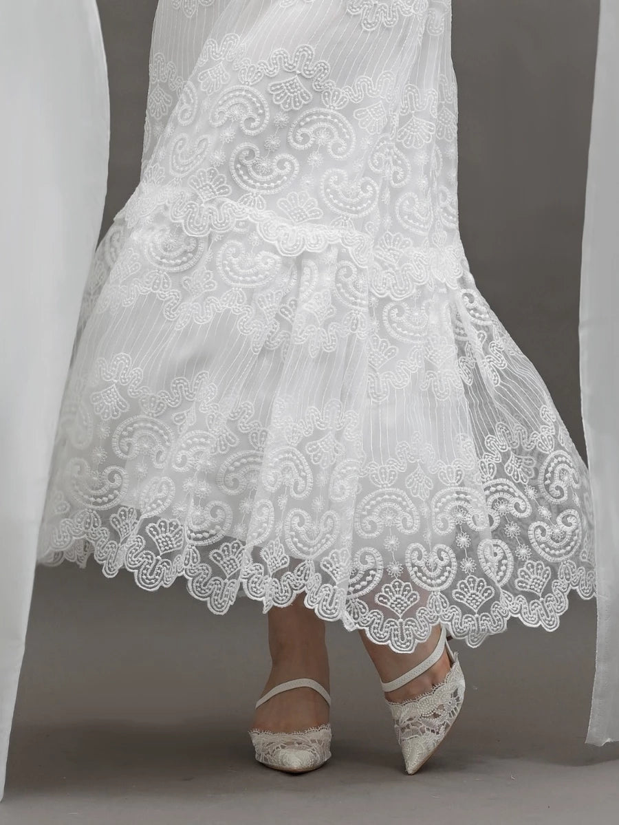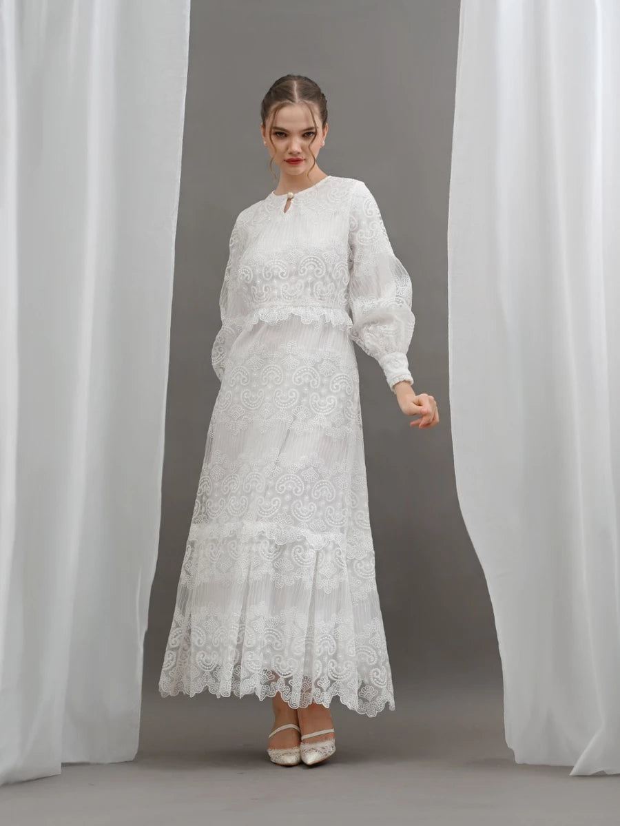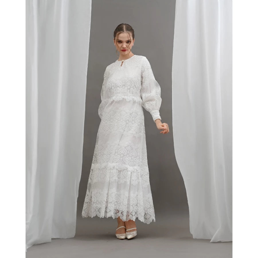 Dress berbahan organza dengan detail bordir yang cantik dan elegan. Didesain dengan detail mutiara pada kerah, fitted waist dan ruffle hem, look elegant instantly in Irene dress.
