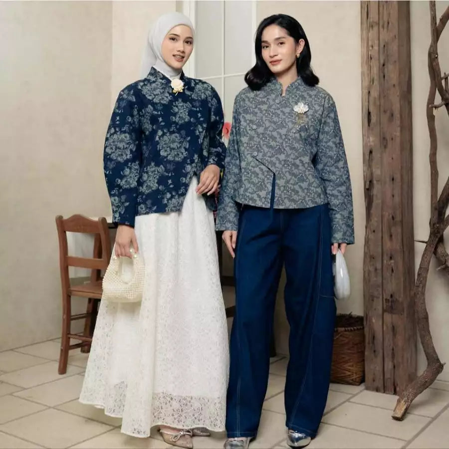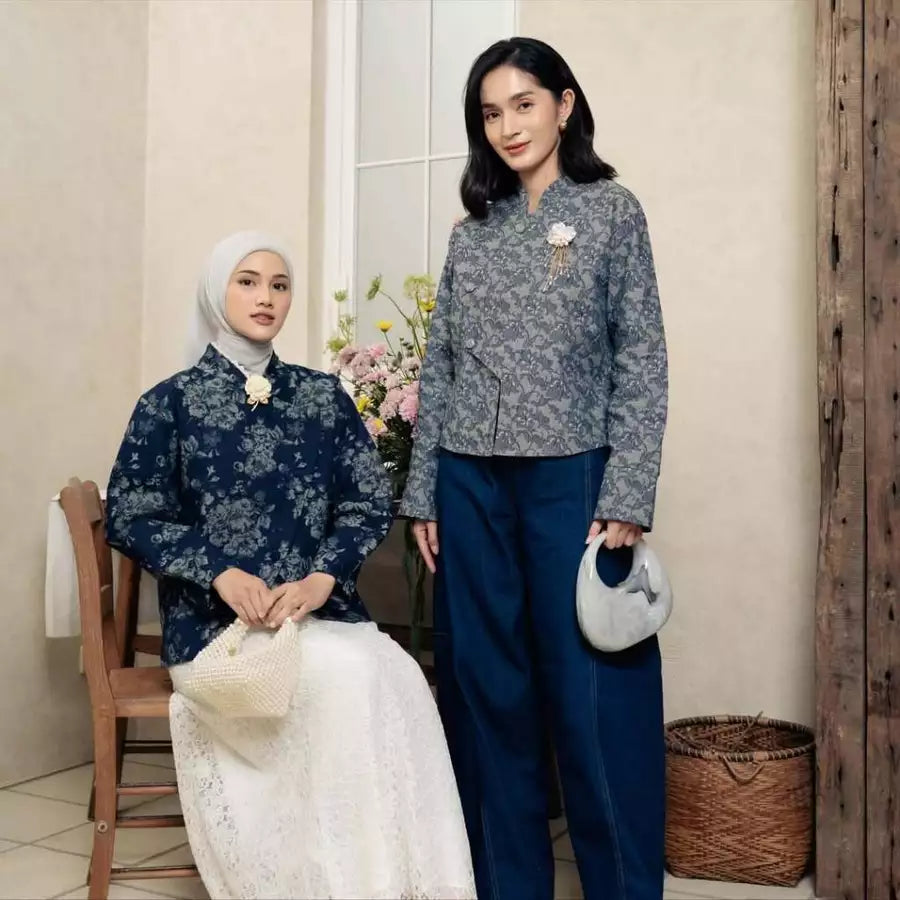 Outer motif bergaya oriental dengan kerah mandarin, potongan depan asimetris, lengan panjang, dan siluet longgar yang terlihat rapi, memberi kesan elegan dan stylist.