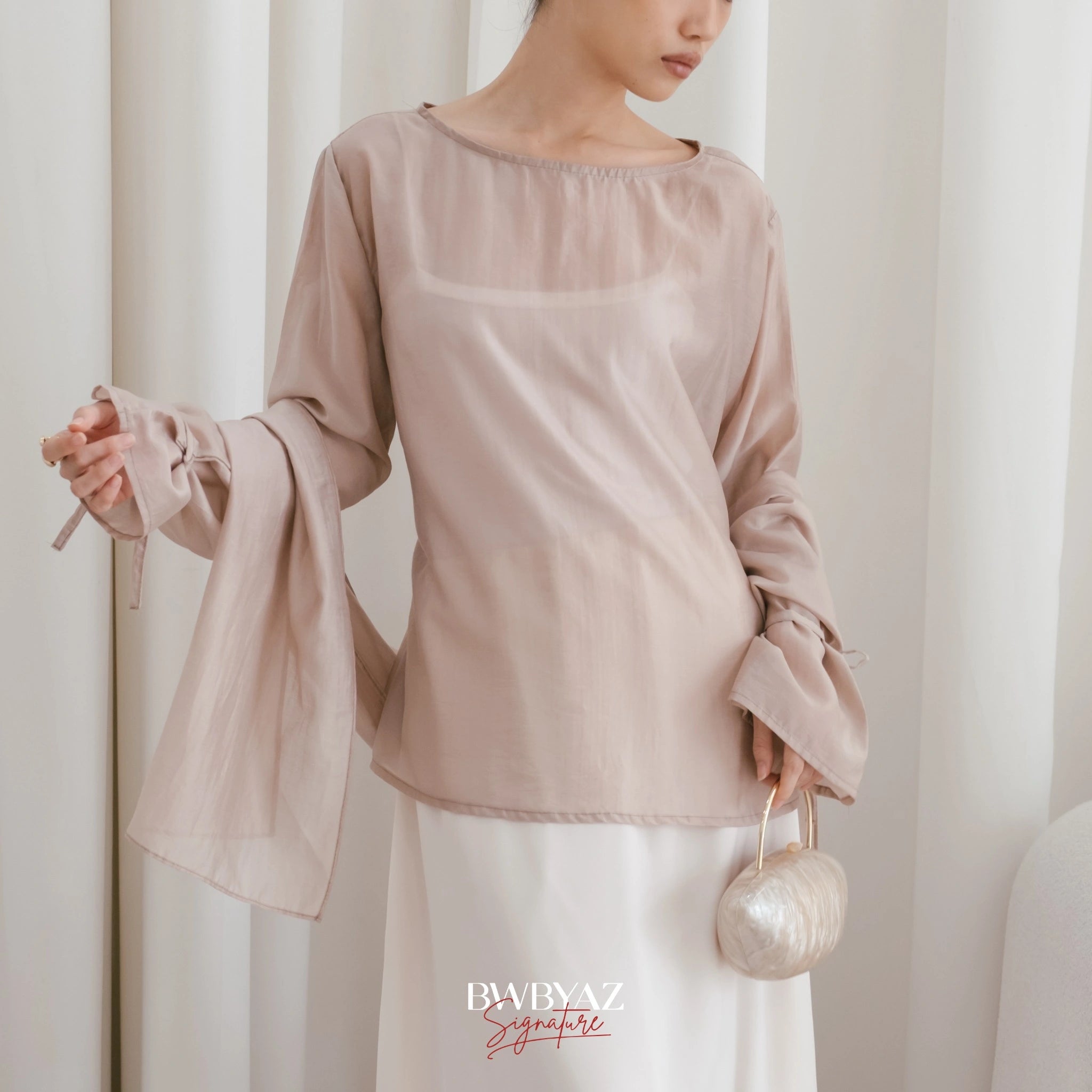 Jemma Shawl Top is made from soft and drapey Luminous Sheer Tencel material, giving a luxurious and feminine impression. It comes with a separate shawl and a small loop at the waist for flexible styling. This top also features tie details on the sleeves and a smooth hem at the bottom. Its loose cut is suitable for a relaxed yet sophisticated look, with sheer fabric that provides an elegant sheen effect under certain lighting.