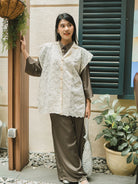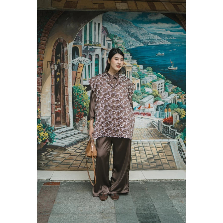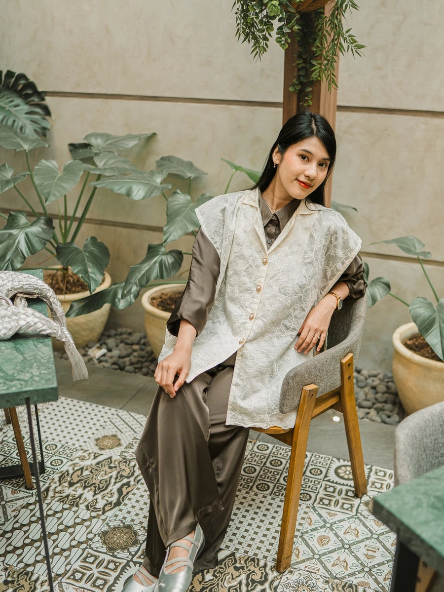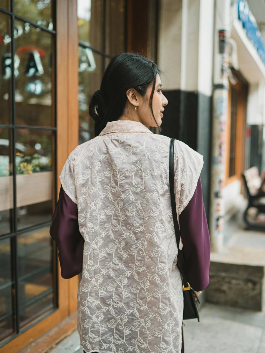 Vest wanita dengan bahan embroidery , memberikan tampilan elegan dan stylish. Cocok dipadukan dengan kemeja, dress, atau inner favorit untuk acara casual maupun semi formal.
