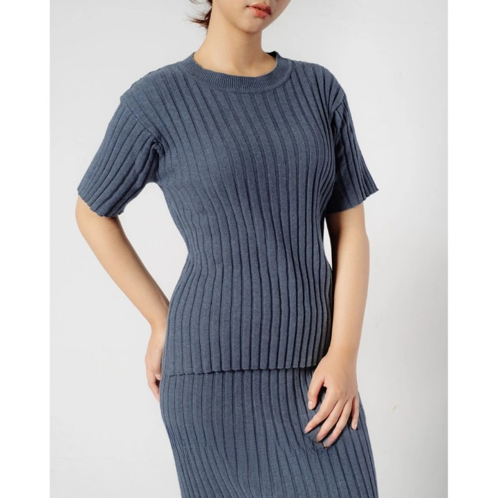 This short-sleeve ribbed top combines comfort and style, crafted from soft, stretchy cotton knit fabric that hugs your silhoutte. Its versatile design makes it easy to dress up or down, whether paired with a matching skirt or your favorite jeans.