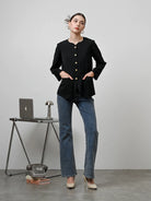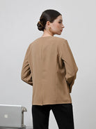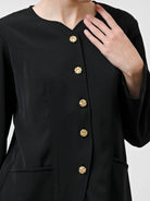 Atasan blouse blazer dengan sentuhan kancing emas. Wear it as a blazer or as a top with your favorite bottons and show your confidence. Elevate daily look kamu instantly.