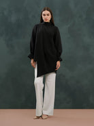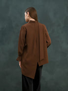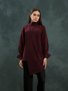 Atasan chic dengan asymmetric drape design dan sentuhan shawl for an elevated look.