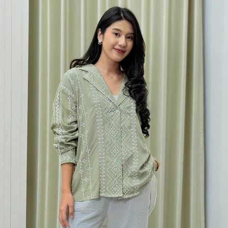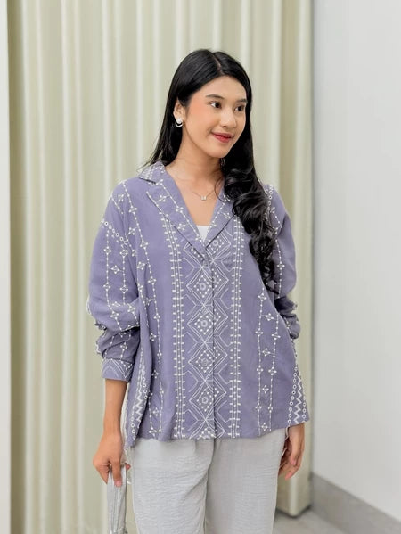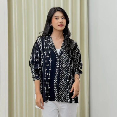 Tampil anggun dan stylish dengan blouse motif ethnic modern yang memadukan bahan katun bordir dan plisket. Nyaman dipakai, cocok untuk acara formal maupun santai.