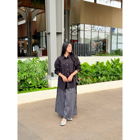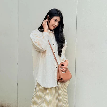 Kemeja oversized dengan design yang elegant menggunakan bahan yang nyaman, hadir dengan kerah reguler, bukaan kancing.