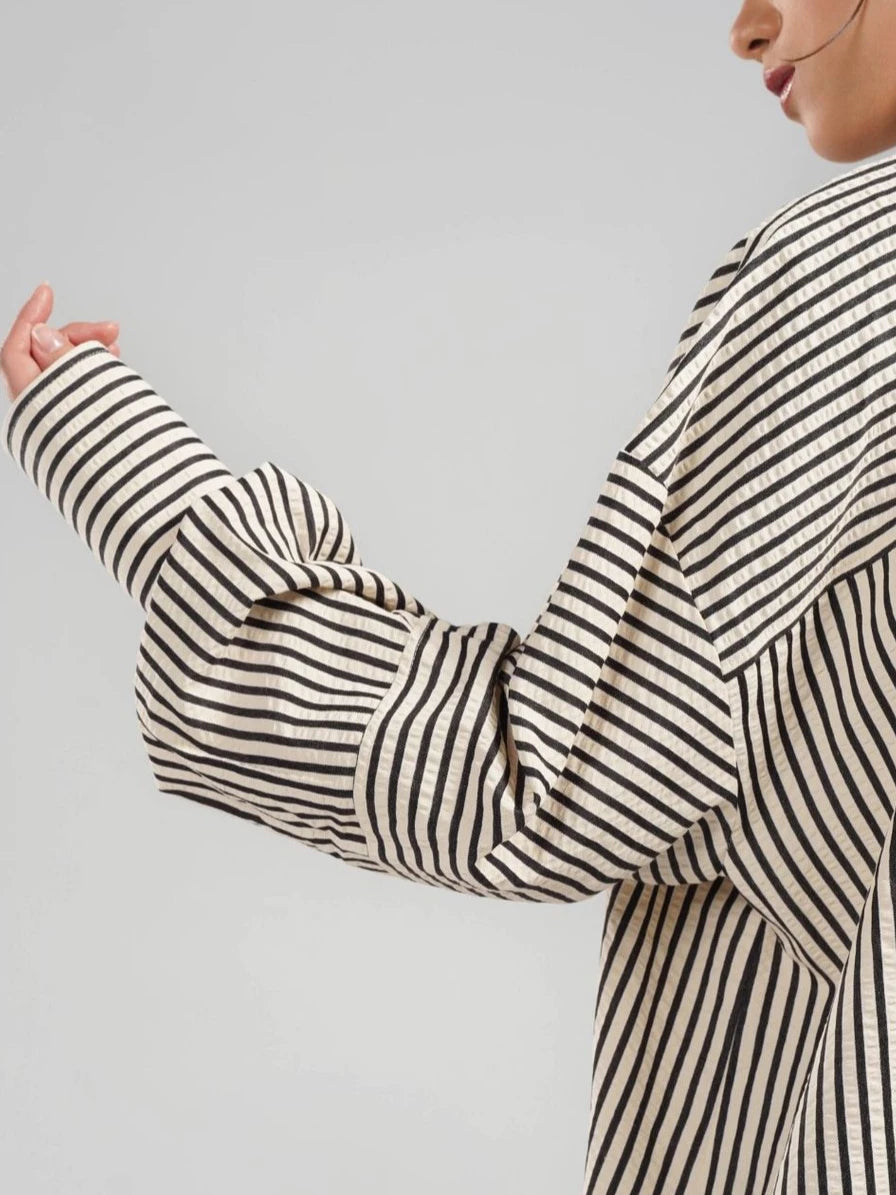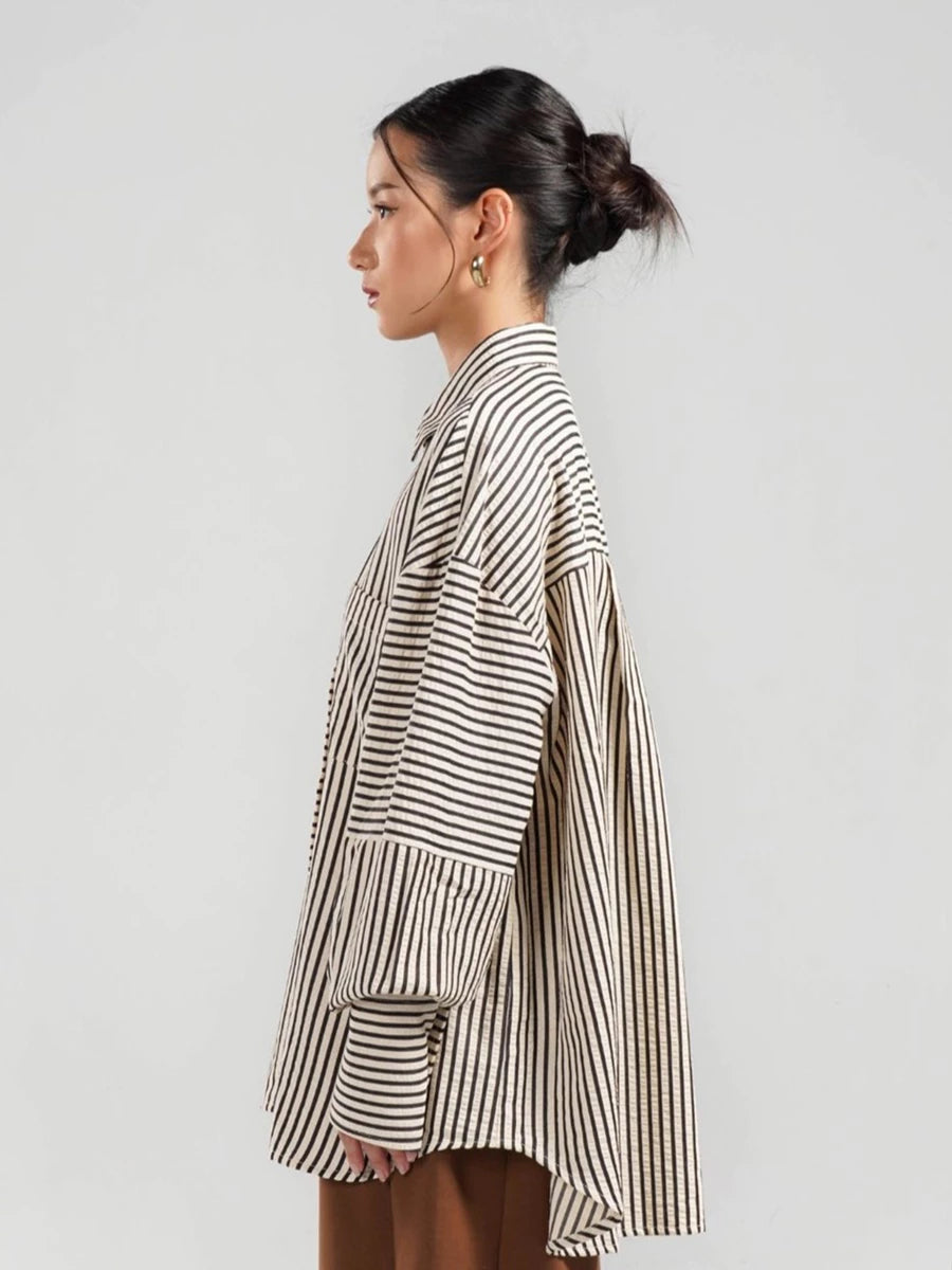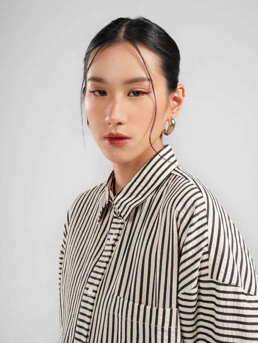 Kemeja lengan panjang bermotif garis dengan bahan seersucker dengan nuansa casual dan stylish. Bahannya ringan, nyaman, dan jatuh, cocok untuk aktivitas sehari-hari. Potongan oversize dengan detail pada bagian lengan tangan (cuff) yang bisa di styling sesuai gayamu dan simple karena gaperlu setrika langsung siap pakai.