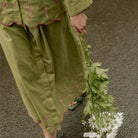 With the special embroidery in pink, the green and pink color combination creates a harmonious and eye-catching ensemble, evoking a sense of nature-inspired elegance.