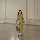 A linen two-piece set in a refreshing green to olive hue (Meadow) comprising a statement shirt and a skirt with a closed-button design, is both chic and comfortable. The natural texture of linen adds a casual and laid-back feel to the ensemble, making it ideal for warm weather or a relaxed yet stylish occasion.