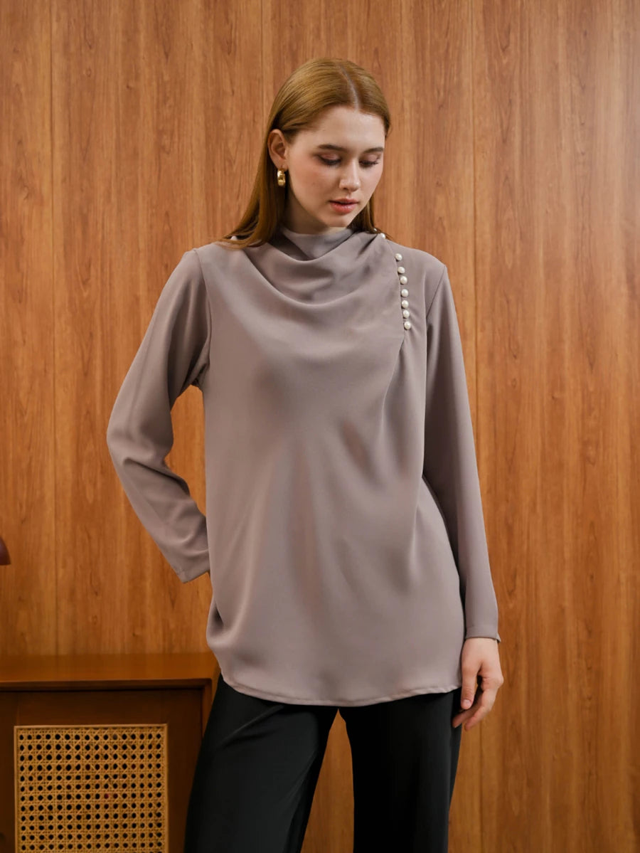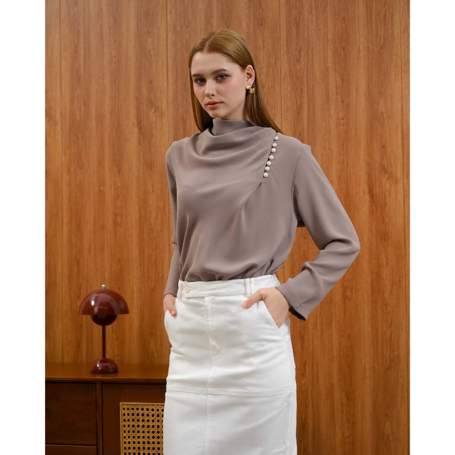 Atasan dengan design drapery ruche dan sentuhan kancing mutiara yang elegan. Dibuat dengan bahan terpilih yang lembut, breathable dan anti-UV siap menemani keseharian kamu. Elevate your daily look instantly. The prefect tops untuk mix and match dengan margot pants, jeans, atau rok apapun dalam lemari kamu.