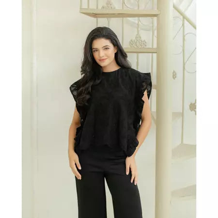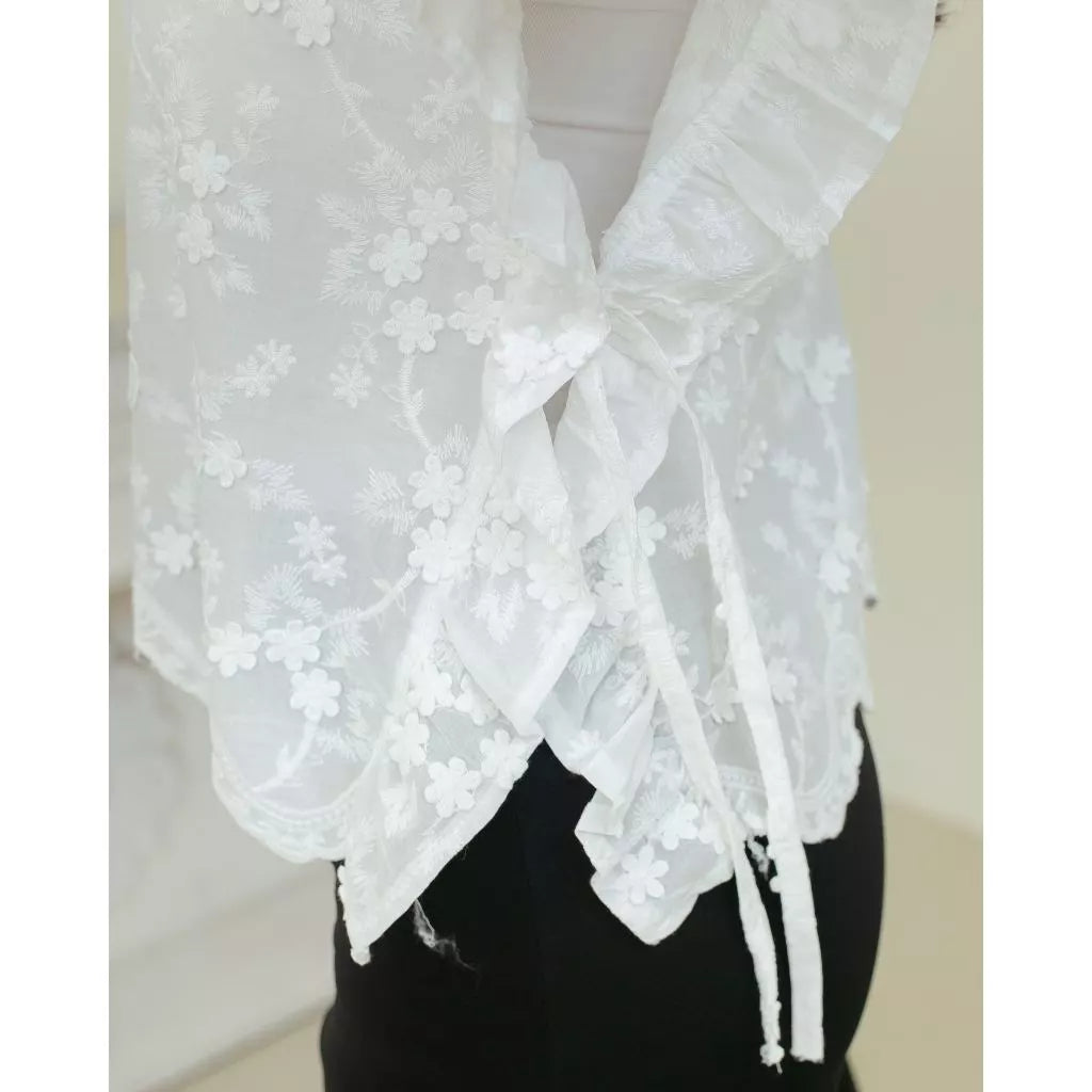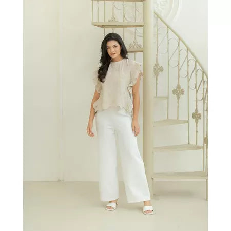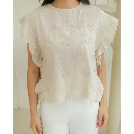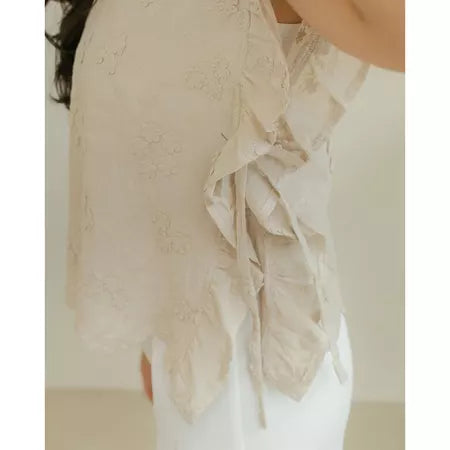 A refined sand embroidered vest featuring tone-on-tone florals that reveal their beauty in the light. Designed with adjustable side ties for a flattering fir, it layers effortlessly over any silhouette. The embroidery offers a subtle play of texture, evoking quiet elegance and thoughtful craftmanship. Perfect for those who favor understated luxury with a poetic edge.