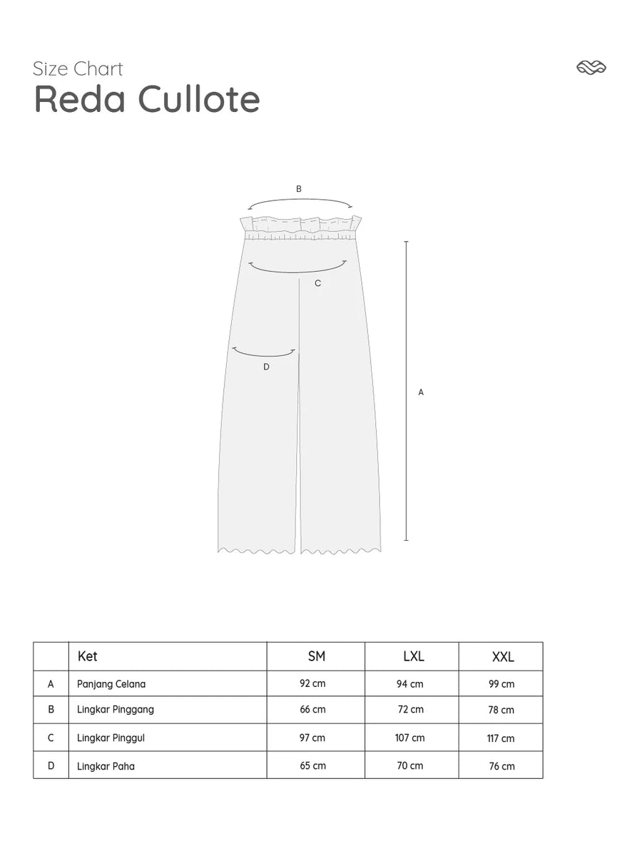 Reda Culotte adalah definisi effortless elegance dalam siluet yang ringan dan tenang. Dirancang dengan potongan yang jatuh lurus dan flowy, memberikan ruang gerak yang nyaman sekaligus tampilan yang refined di setiap langkah.