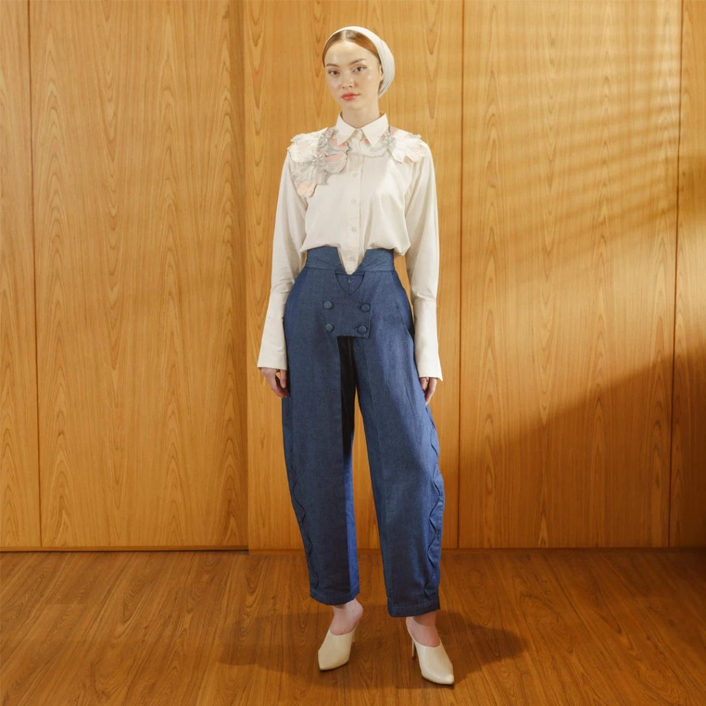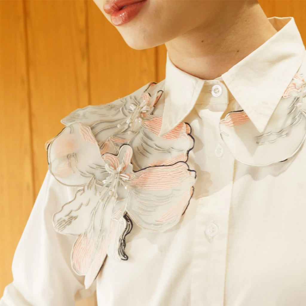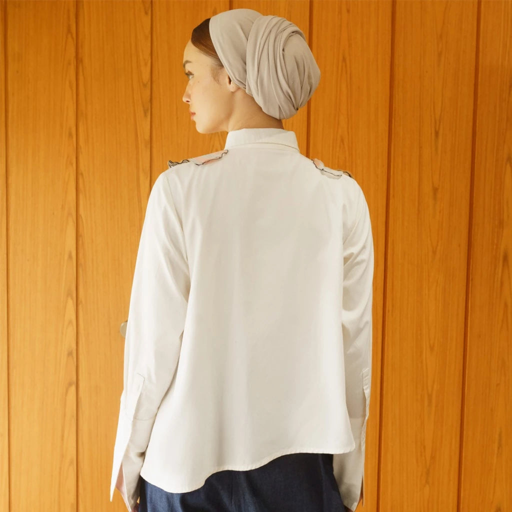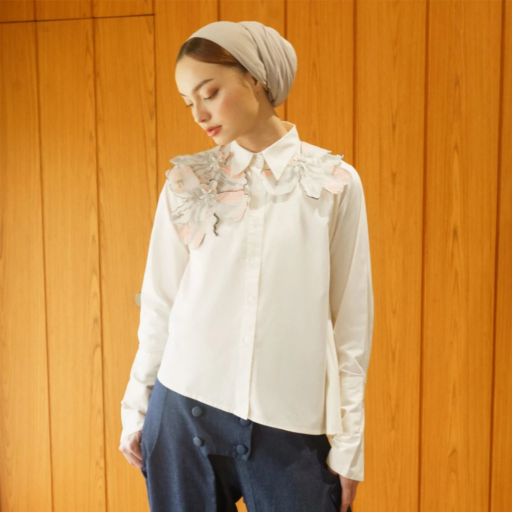 Reline Top is an elegant asymmetric blouse crafted from breathable cotton fabric. It features a hidden front button closure, uniquely tailored buttoned cuffs, and a beautifully flowy asymmetrical hem. The standout detail is its intricate 3D floral embroidery embellished with Jenna and Kaia signature handmade beading.