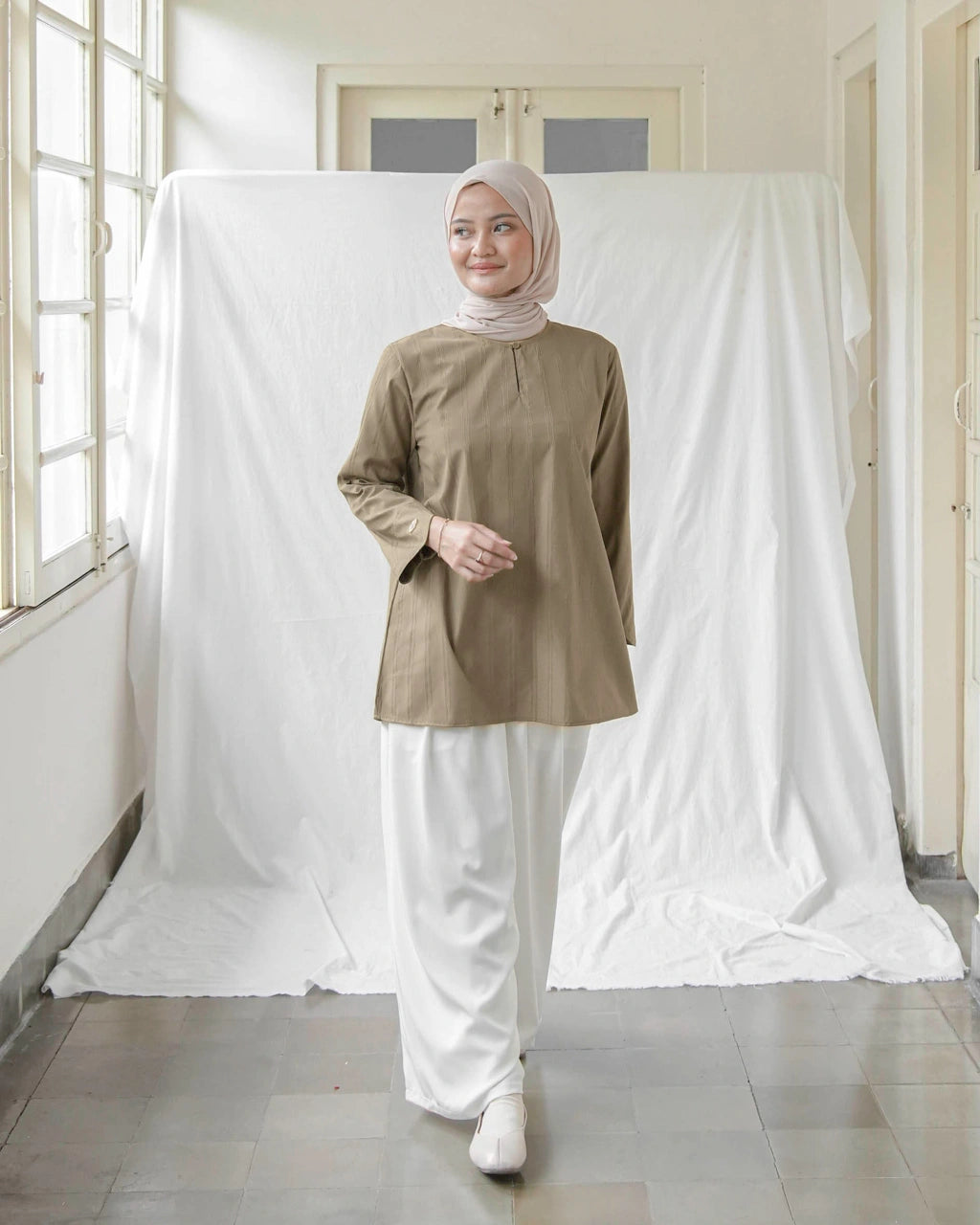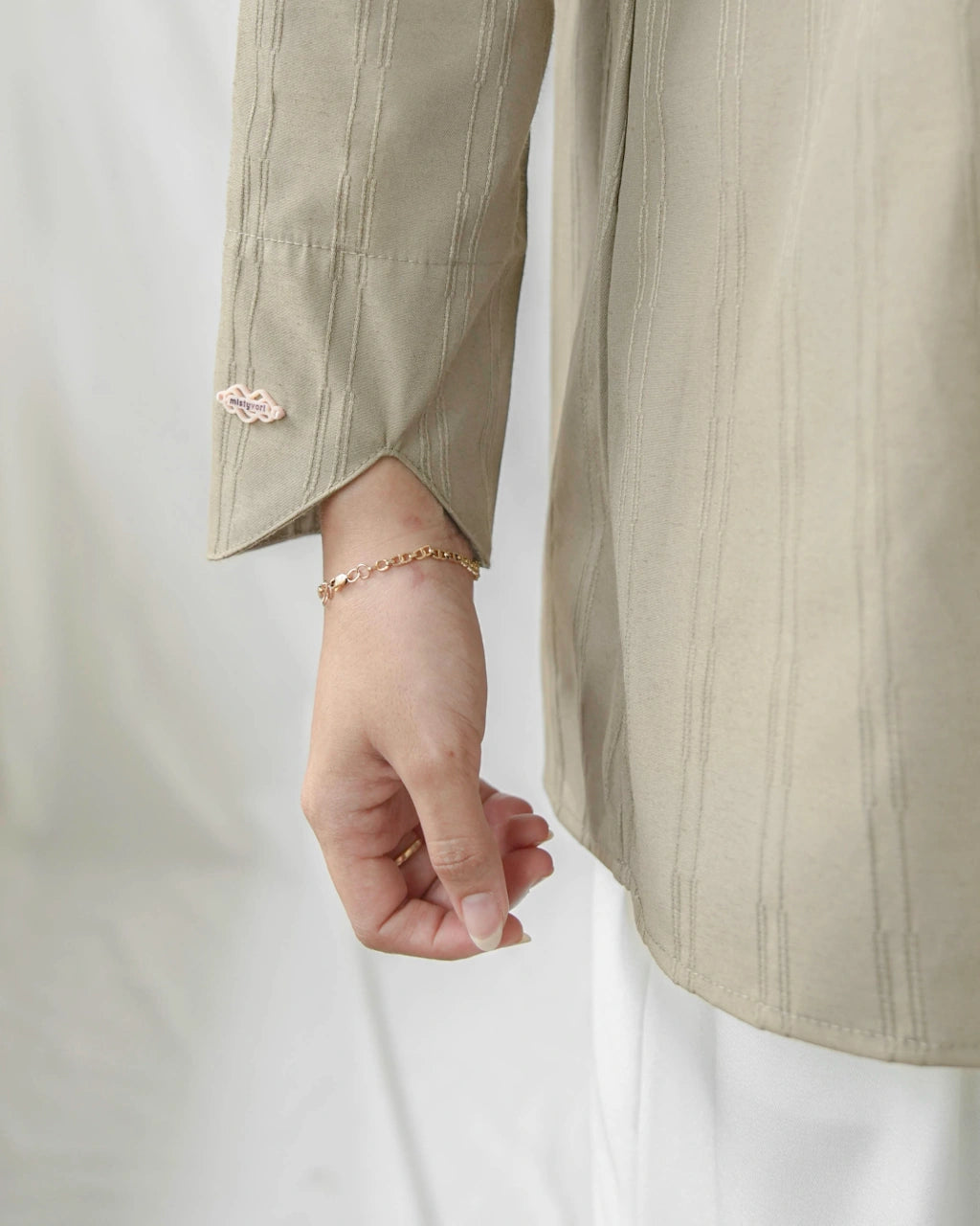 Menggunakan material bahan Cotton Dobby yang lembut, ringan dan tidak mudah kusut. Model bagian depan sudah menggunakan kancing pengait dengan aksen potongan di bagian lengan, kerah sudah menggunakan kerah O-neck. Memiliki tekstur unik yang dihasilkan dari tenunan khusus berupa pola rel. Material berdaya serap tinggi sehingga nyaman dan adem saat digunakan. Sudah dilengkapi dengan logo akrilik khas Mistyvori.