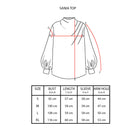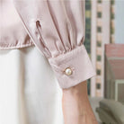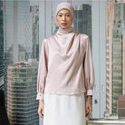Detail: Kerah drapping ber-volume, lengan manset, special button
