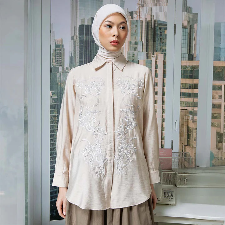 Detail: Kerah kemeja, hidden button, lengan manset, detail flower ebroidery