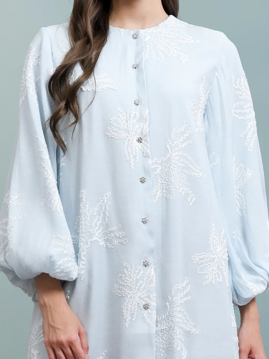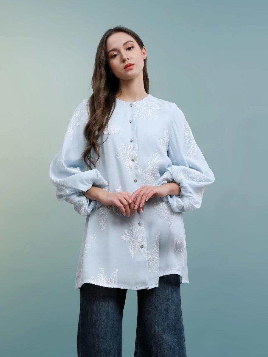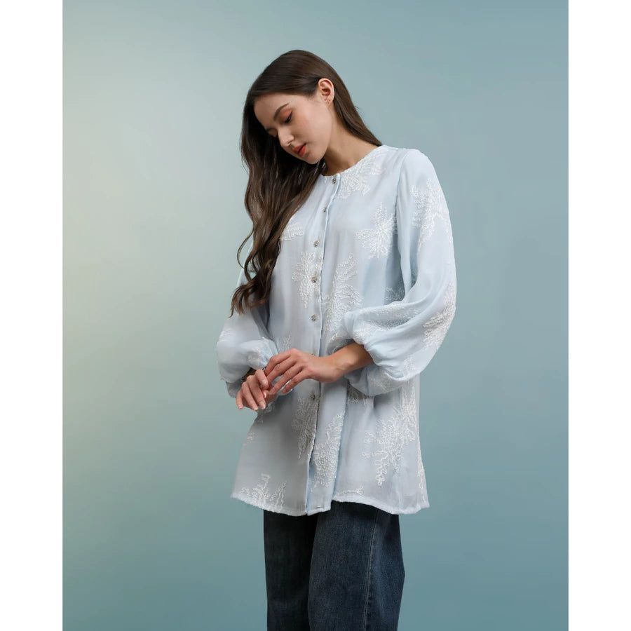 Blouse dengan detail bordir manis dan lembut with airy texture. Didesain dengan detail kancing yang unik dan puffy sleeves. Perfect for any agenda and can easily match with any bottoms.
