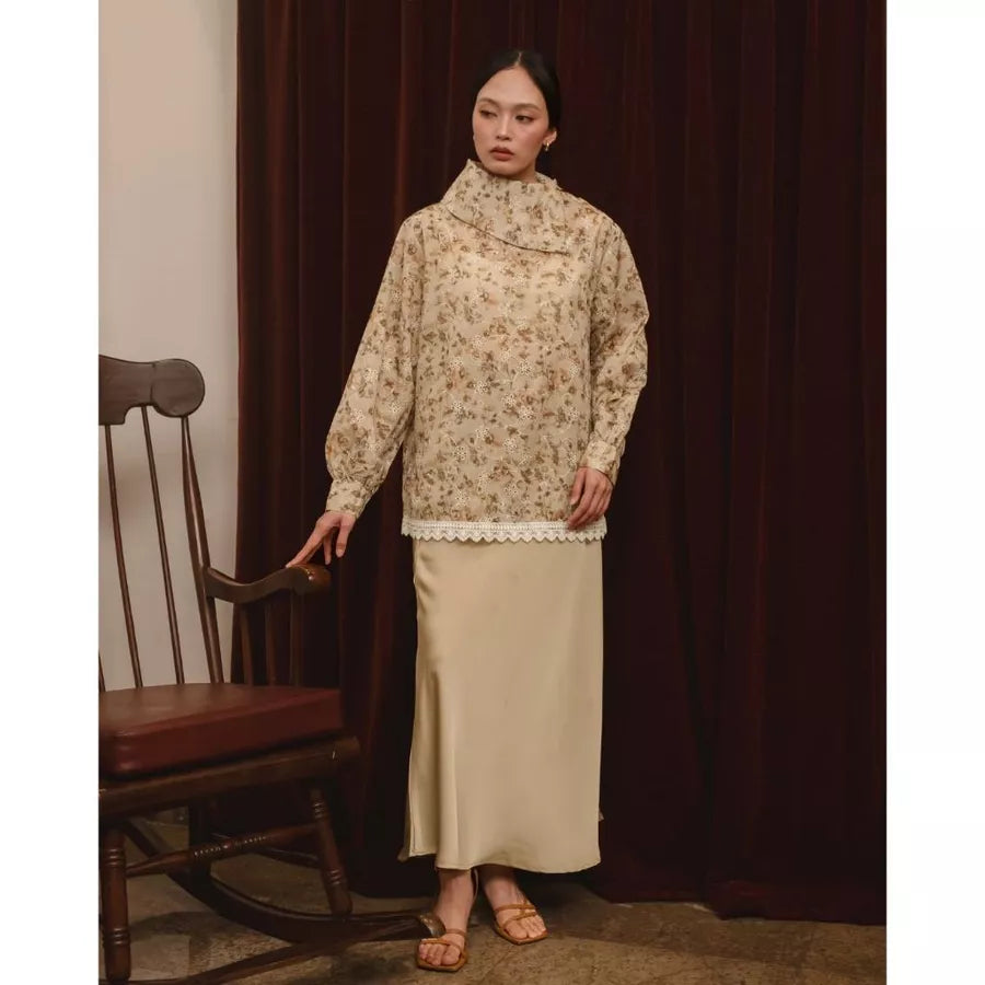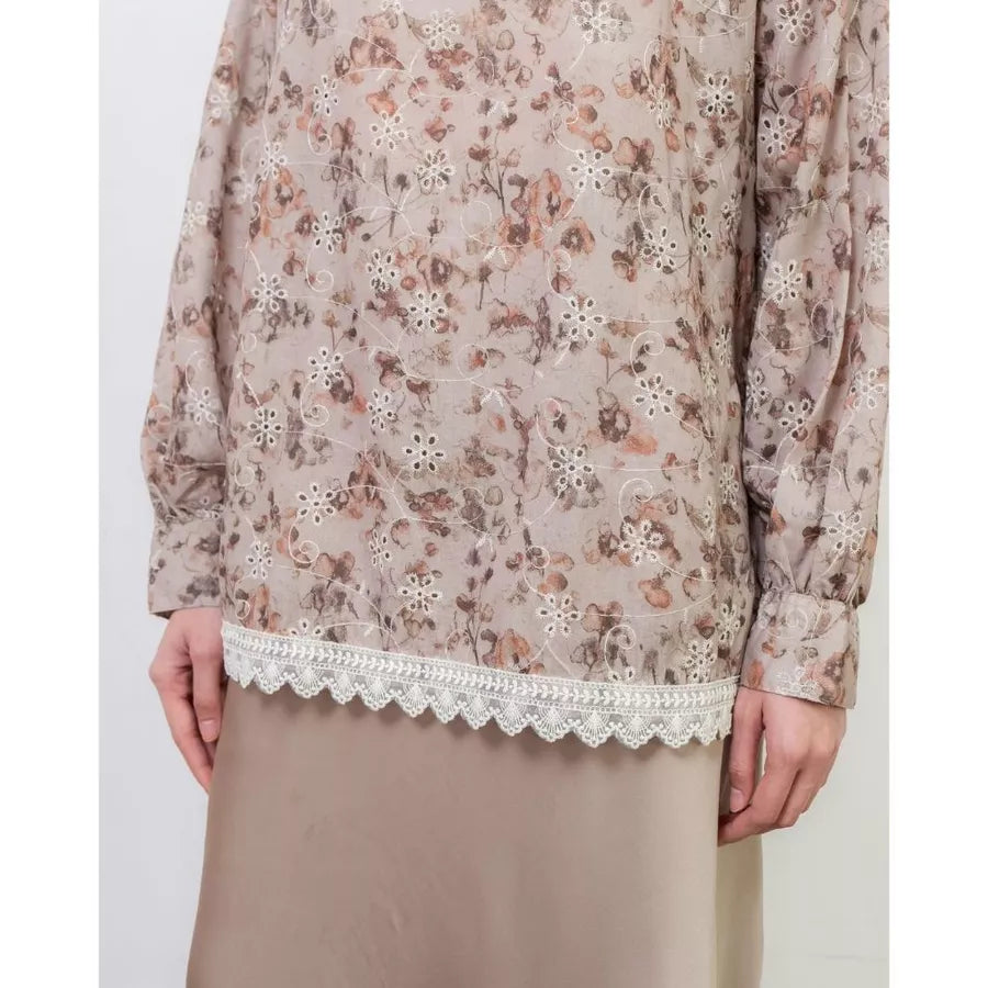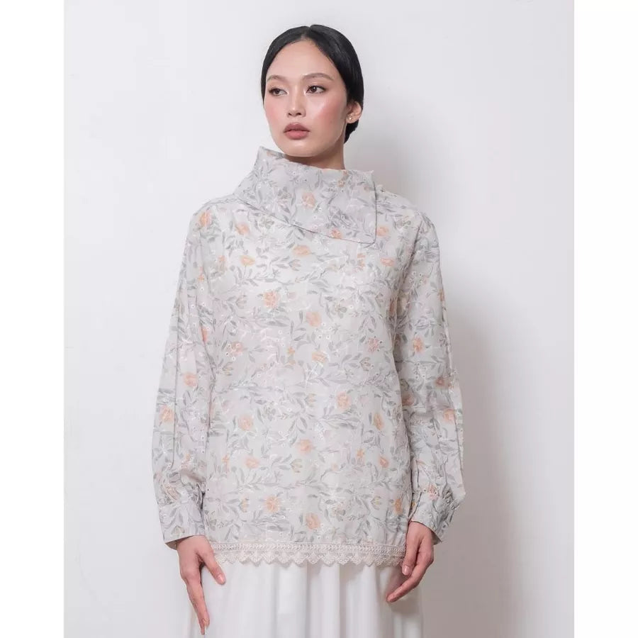 Blouse dengan motif floral dan kerah asimetris memberi kesan modern dan feminin. Berbahan cotton bordir yang lembut dan menyerap keringat, sehingga sejuk dipakai seharian.