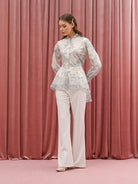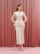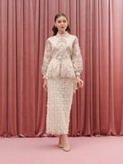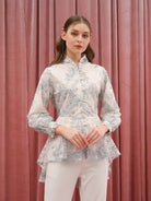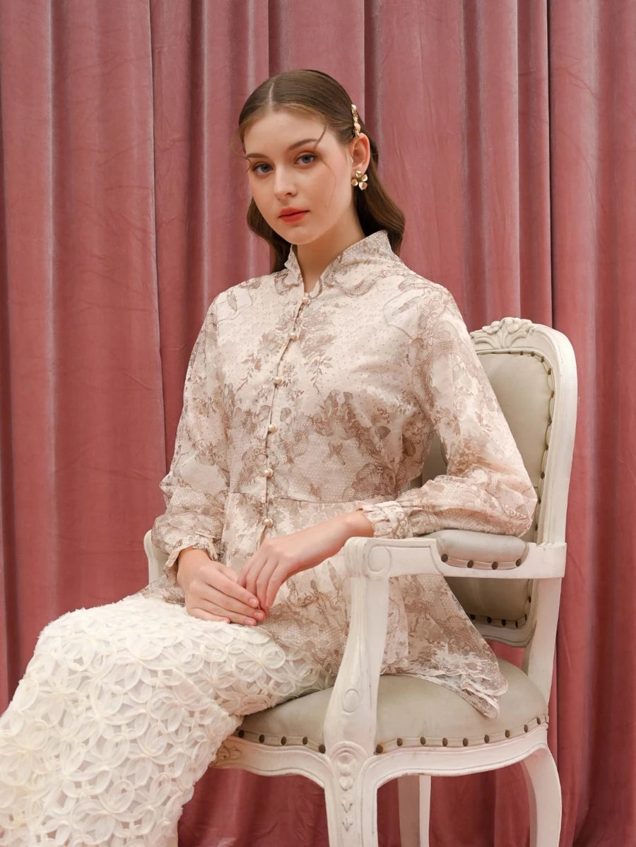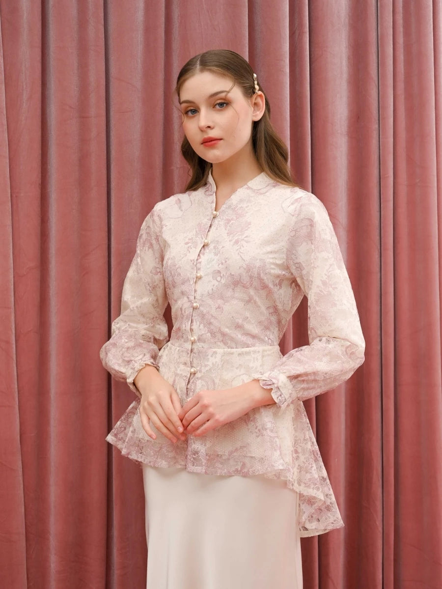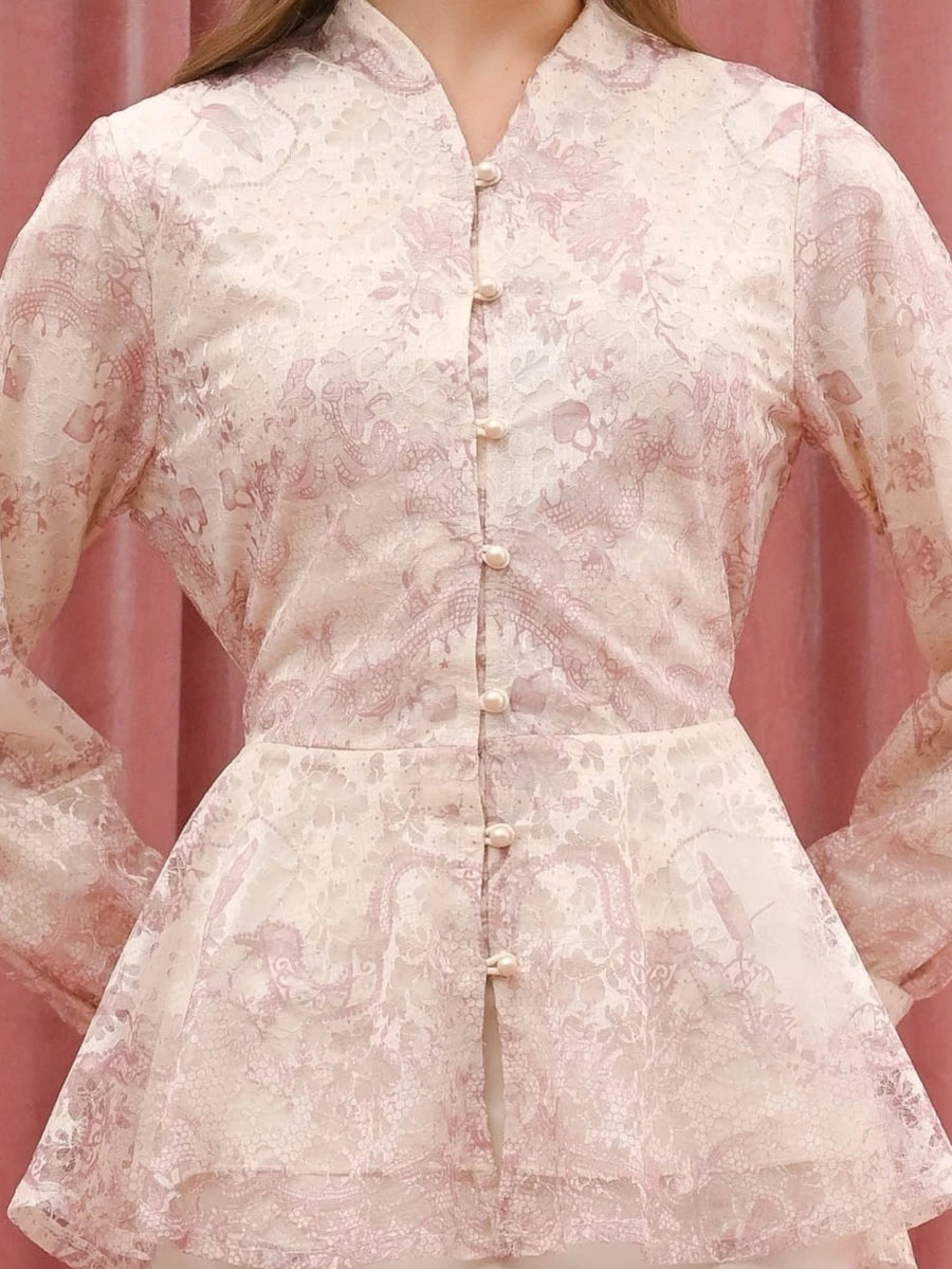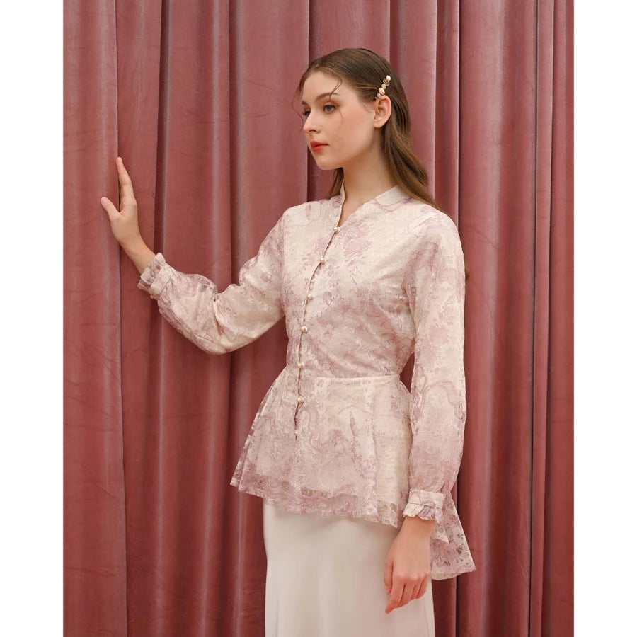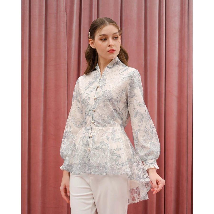Atasan dengan signature pattern print kasa pada bahan lace yang lembut. Didesain dengan cuttingan peplum dan tali pinggang yang dapat diikat ke belakang untuk menyesuaikan bentuk badan masing-masing. Dilengkapi juga dengan kancing mutiara yang elegan.