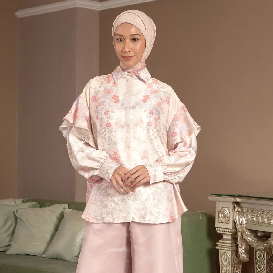 Detail : Silhouette loose/boxy dengan lengan puff, kerah klasik, Bukaan kancing penuh di bagian depan.