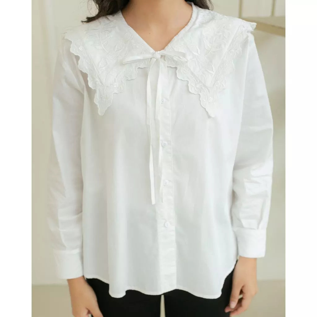 An elegant white top adorned with tone-on-tone embroidery along the collar, offering a refined touch of texture and detail. A soft ribbon tie at timeless femininity. Crafted from a fluid fabric that drapes beautifully, it moves with quiet confidence. Designed for effortless sophistication, it's a piece that speaks softly but leaves a lasting impression.