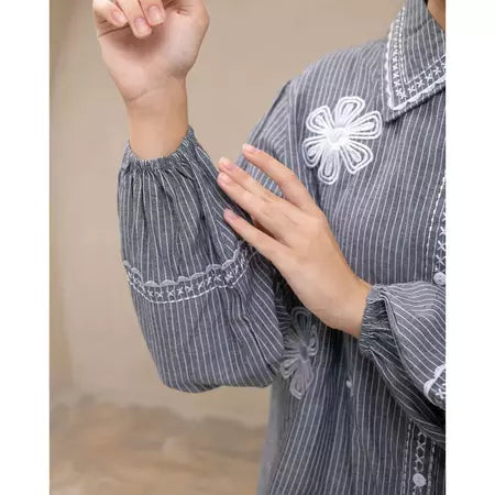 Beautiful dark grey top features six blooming embroidered flowers delicately placed around the garment, creating a stunning floral design that wraps the piece with charm and elegance. The intricate embroidery adds a touch of artistry and sophistication, making it a perfect choice for adding a unique, feminine touch to any outfit. Ideal for both casual and semi-dressed occasions.