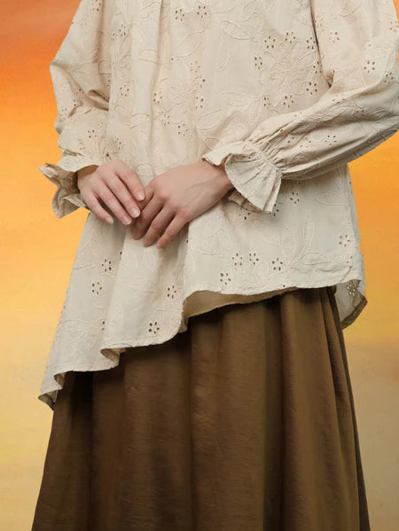 Blouse chic berbahan cotton dengen detail bordir bunga yang sweet and intricate. Didesain dengan asymmetric cut, the perfect balance between classic modesty and contemporary flair. Perfect for daily wear, work, or social occasions.