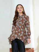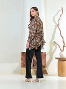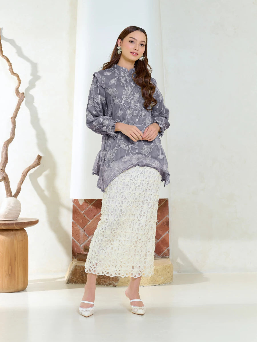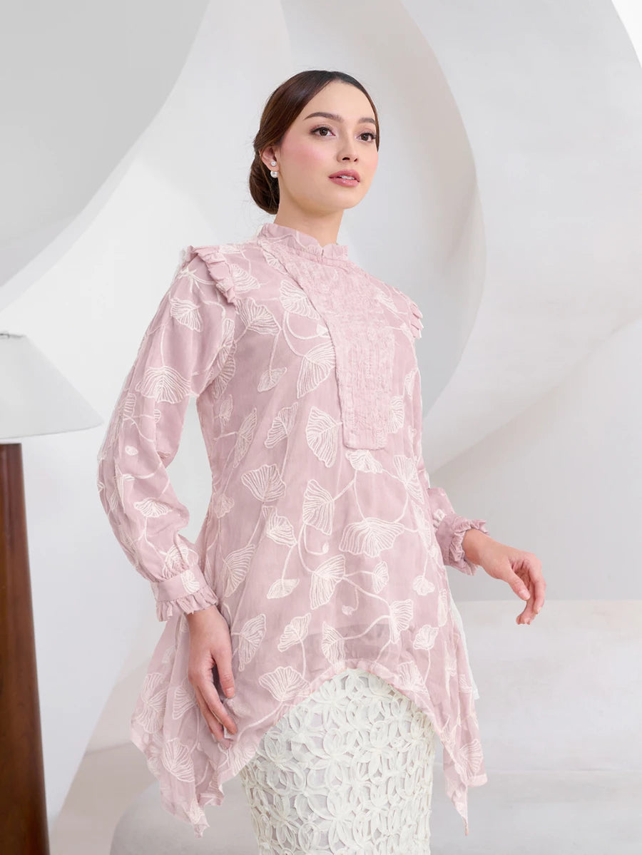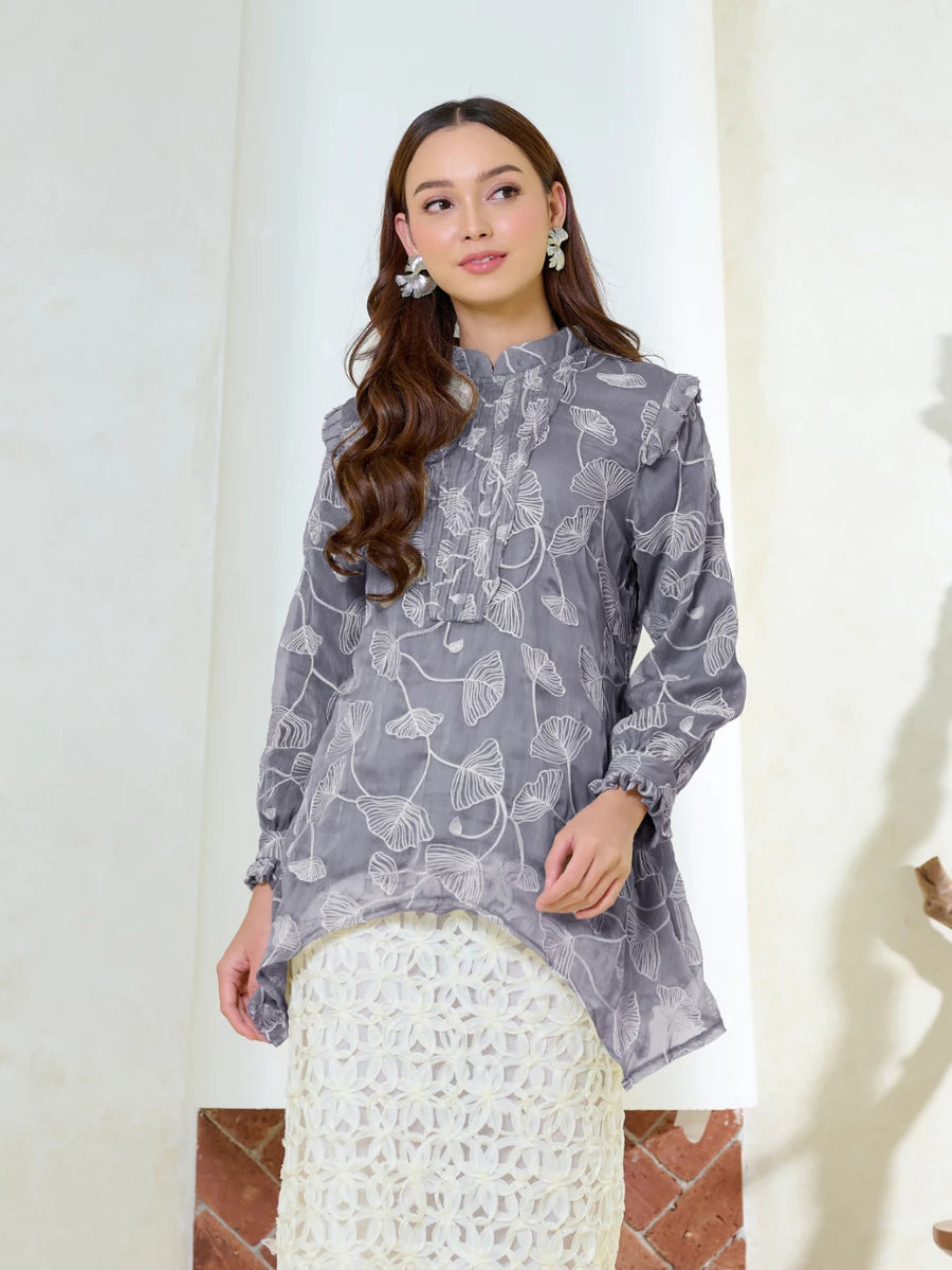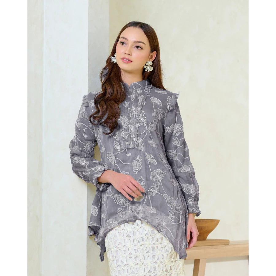 Blouse elegan berbahan chiffon crinkle yang memberikan texture menarik dan detail bordir bunga gingko yang elegan. Didesain dengan detail pleats dan ruffles yang menambahkan sentuhan manis. Cuttingan asimetrisnya juga memberi aksen spesial dan dilengkapi tali samping untuk memberikan fit sempurna pada semua wanita. Perfect for when you want to look extra special and can easily match with any bottoms.