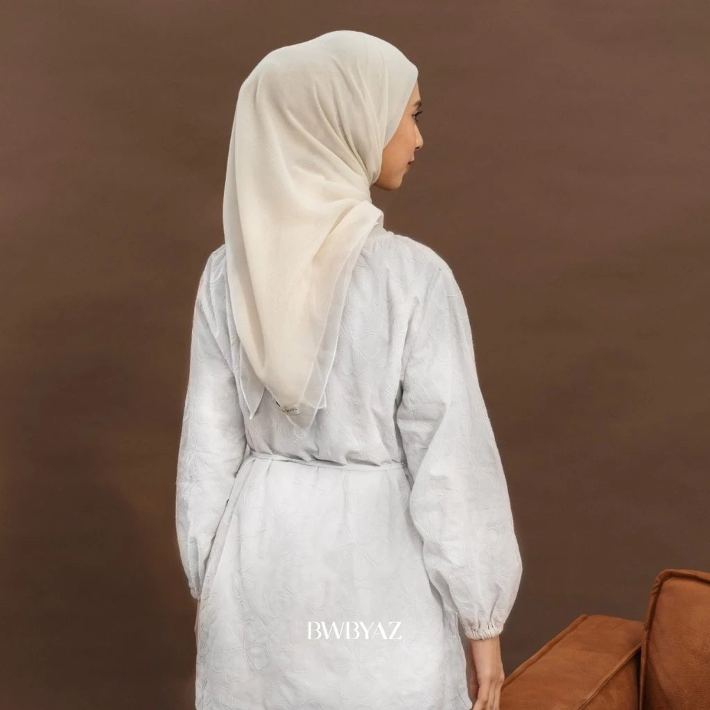 Zainab Long Tunic A graceful tunic made from Cotton Lace Premium with delicate floral pattern, offering a soft and breathable feel. Reversible design, allowing you to wear it two ways for a versatile look. Features tie details at the neckline and bishop sleeves with elastic cuffs, adding an elegant and timeless charm to your style.